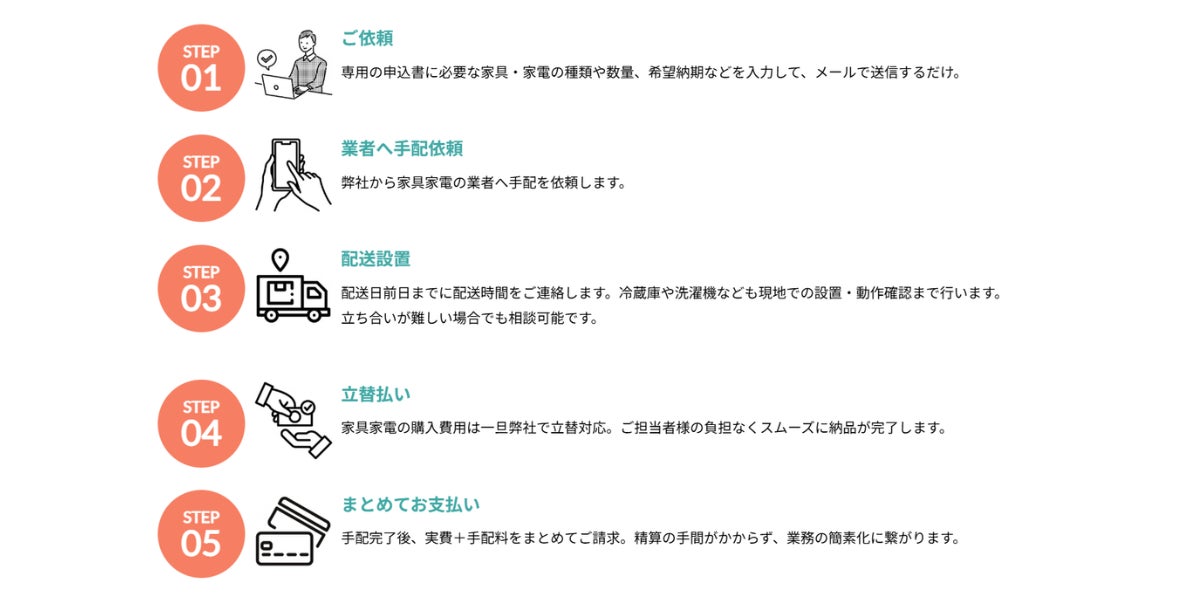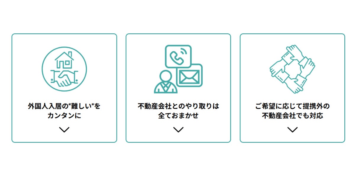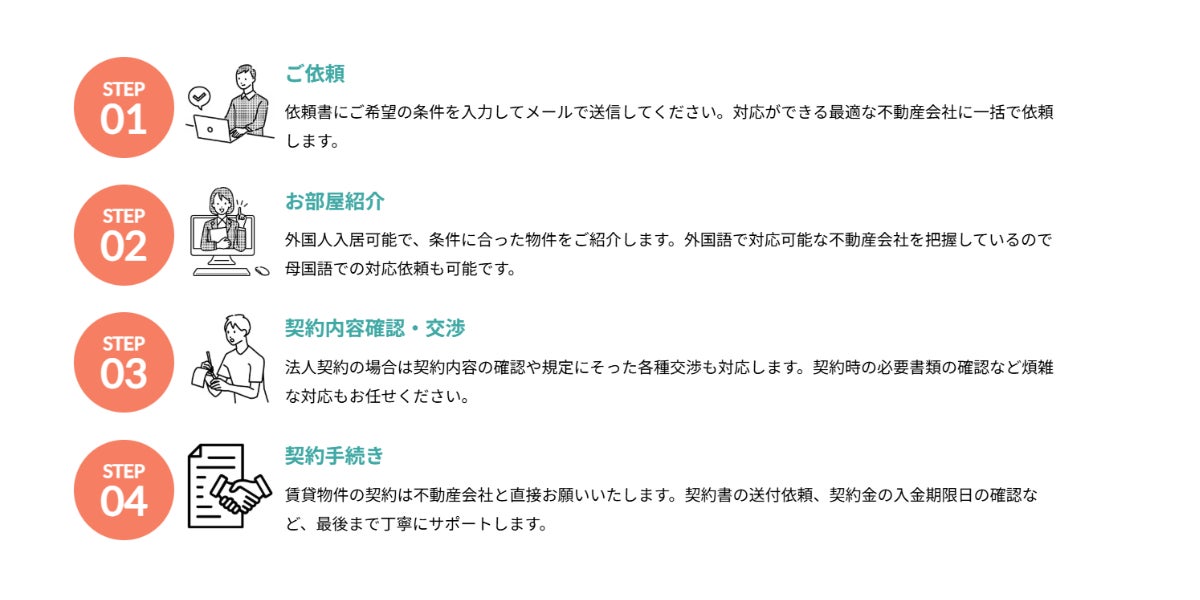 サービス概要:外国人を雇用する企業ご担当者様、外国人の採用支援を行っている登録支援機関・人材紹介会社の営業担当者様の業務の負担軽減を目的として、外国人が居住するお部屋探し、ライフライン、家具家電、引越しの手配などをワンストップで行うサービスです。
