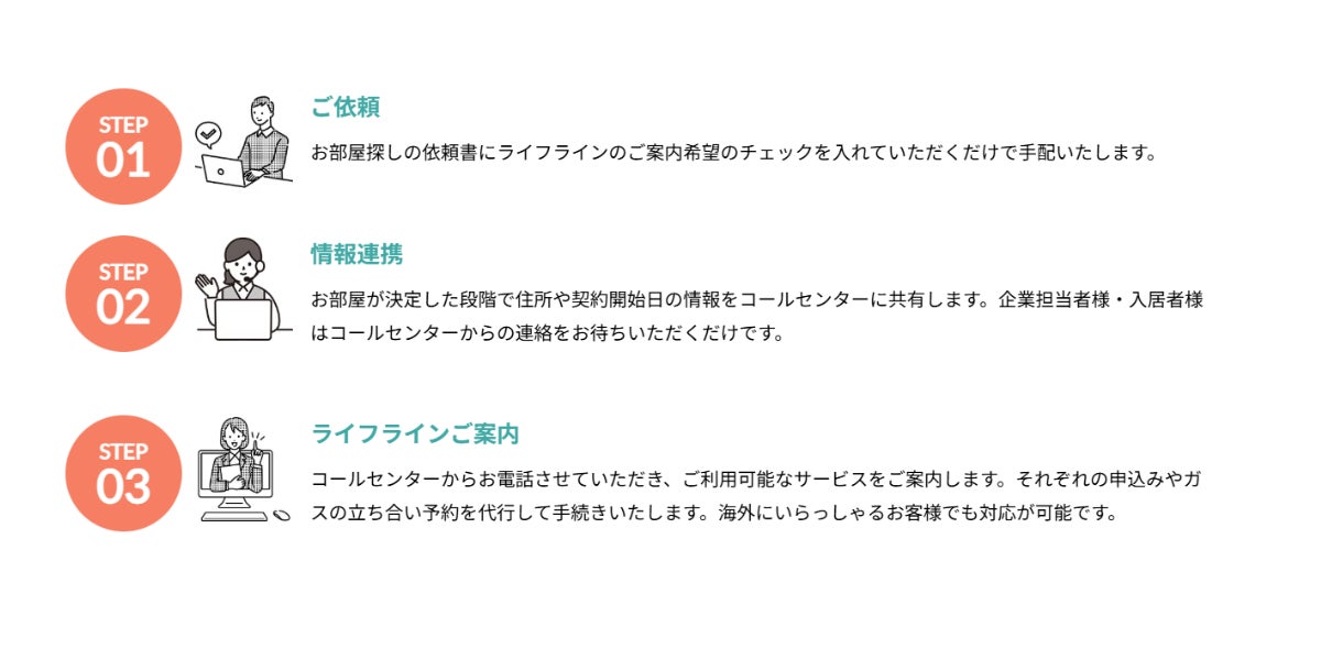 コールセンターからの電話一本で、電気・ガス・水道・インターネットの手配が可能です。海外在住で日本の電話番号をお持ちでない外国人の方でも、手続きが行える体制を整備。
