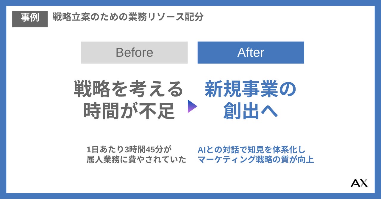 AIエージェントの活用によって「人手を増やさずに効率化する」「外注に頼らず内製化する」「戦略に時間を回せる」といった変化が生まれ、生産性向上だけでなく、新規事業やマーケティング戦略など“攻めの時間”を創出する取り組みへとつながっています。