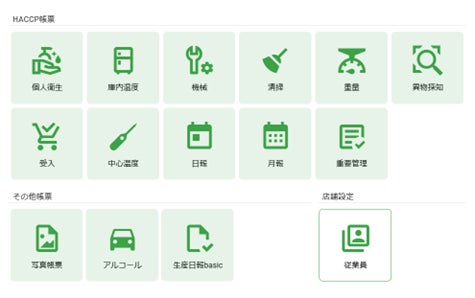 「個人衛生管理」、「庫内温度管理」、「機械管理」、「一般衛生管理」、「日報」、「月報」など、