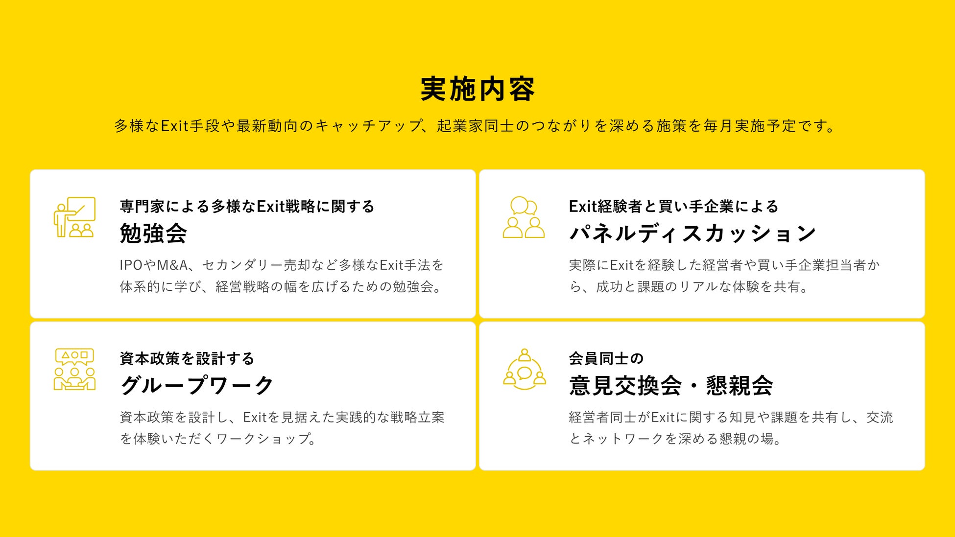 本コンソーシアムでは、多様なExit手段や最新動向のキャッチアップ、起業家同士のつながりを深める取り組みを毎月実施予定です。