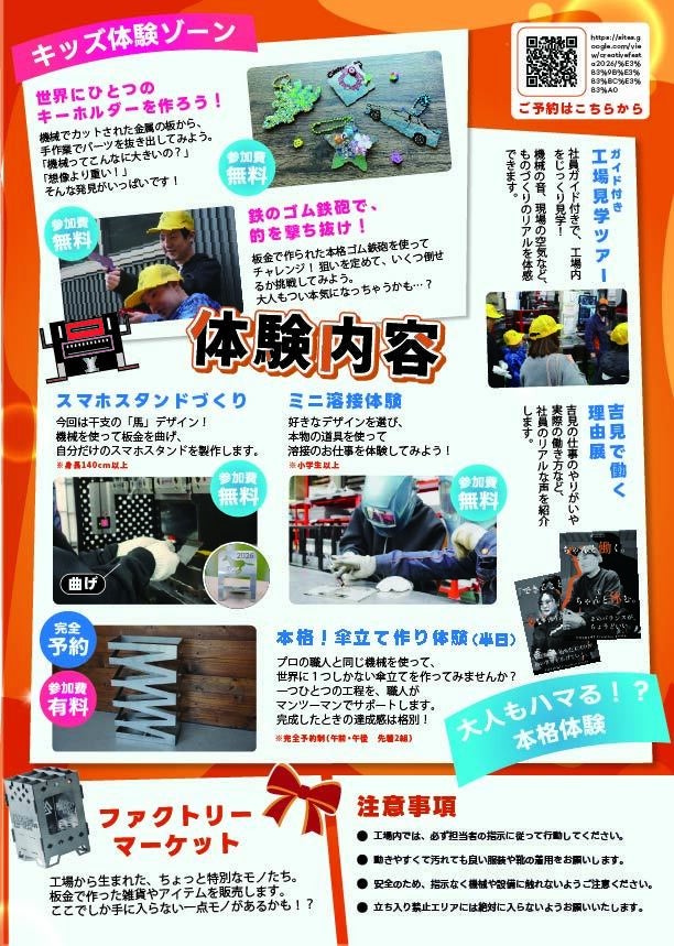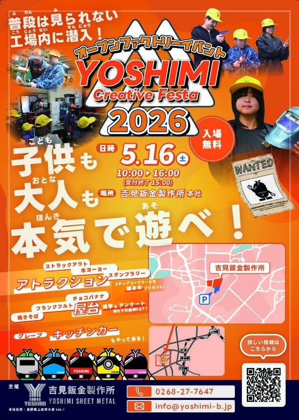 株式会社吉見鈑金製作所(本社:長野県上田市、 代表取締役:吉見 昌高)は、2026年5月16日(土)、本社工場にて体験型オープンファクトリーイベント『Yoshimi Creative Festa 2026』を開催します。