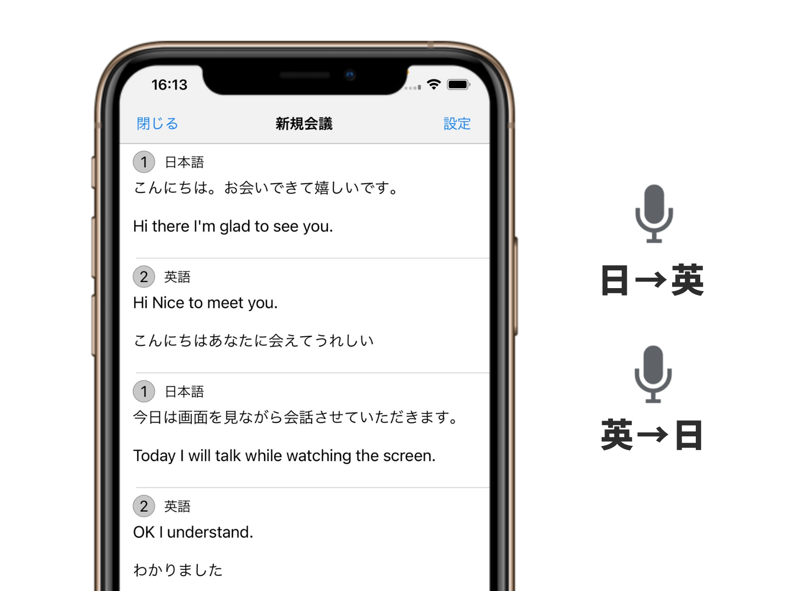 マイク毎に言語を設定することで、日本語は英語に、英語は日本語にといったリアルタイムの同時通訳機能も実現しています。既存のシステムのようにボタン等で言語を切り替える必要がなく、実会話と同じようなスムーズなコミュニケーションを実現します。