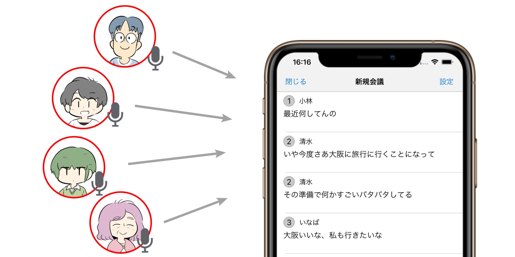 マイクを複数使用することで、最大9名の同時文字起こしに対応。発言が重なったり、会話の割り込みが発生してもすべての発言を文字起こしできるほか、マイクに名前を付けることで「誰が何を話したか」が一目でわかるデザインを実現しました。