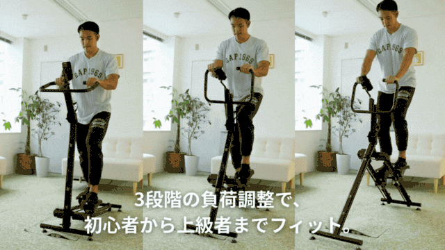 体力レベルや目的に合わせて負荷を選べる「3段階ステップ角度」設計を採用。