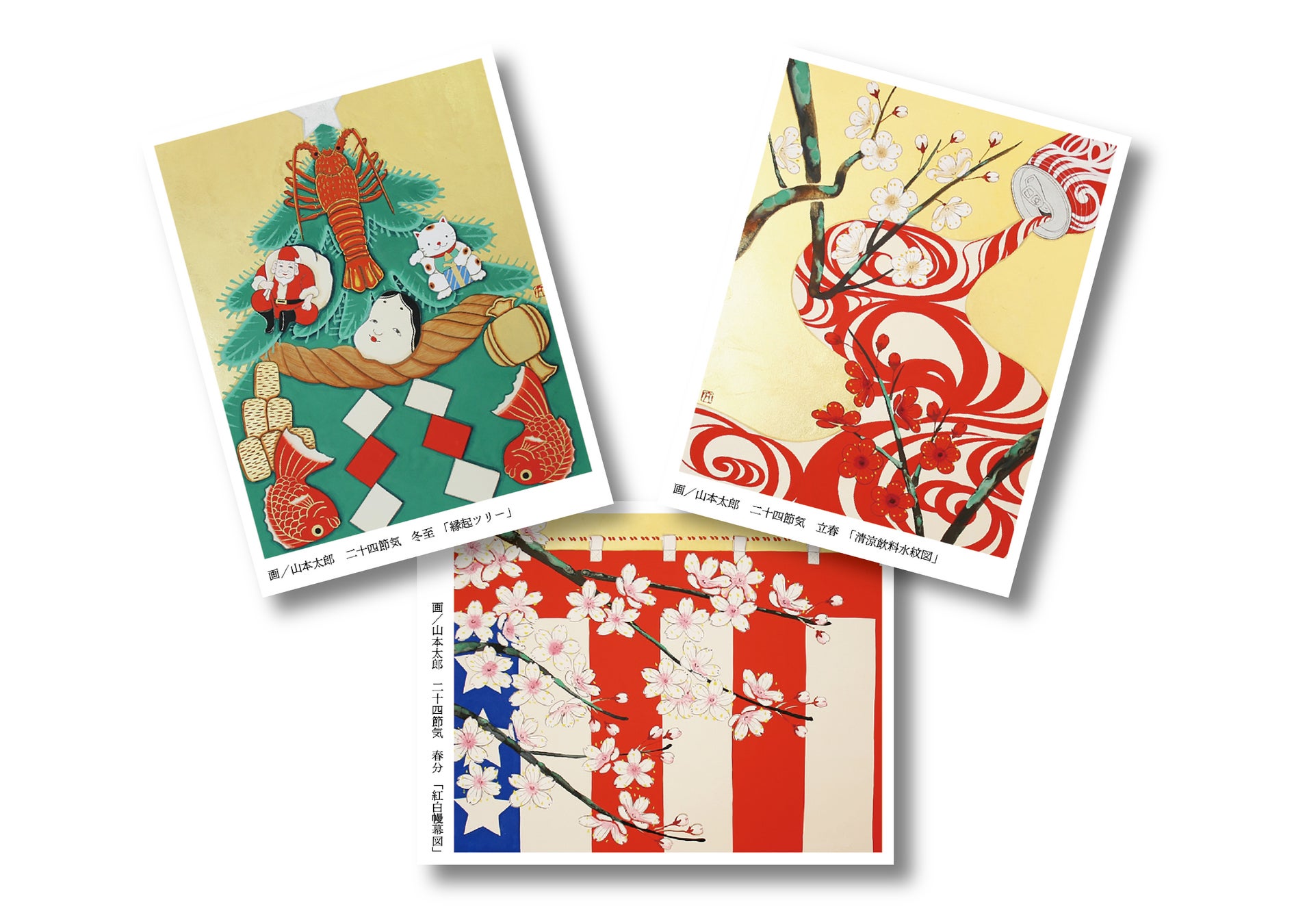 参加方法は京都市内の銭湯で無料配布される、御朱印帳のような蛇腹型のラリー冊子「二十四節気 湯めぐり帖」を入手し、入浴した後に番台に提示すると、その時の二十四節気にちなんだ絵柄のステッカーがもらえる、という仕組み。ステッカーのデザインに採用されたのは、「湯道文化振興会」が推薦した、京都に縁ある画家の山本太郎氏が描いた二十四節気をテーマにした“ニッポン画”です。山本氏は京都造形芸術大学(現・京都芸術大学)の在学中、寺社仏閣とファーストフード店が至近距離で混在する京都にインスピレーションを受け、日本の古典絵画と現代の風俗が融合した絵画【ニッポン画】を提唱、現在も様々な作品を描き続けています。今回の企画に採用された【ニッポン画】も二十四節気の季節感を見事に切り取りながらも、五重塔とクリスマスツリーが並ぶなど、美しくもどこかユーモラス、そして京都らしさも感じられる絵画たちで、「二十四節気 湯めぐり帖」は節気ごとにそのステッカーを貼付し、コレクションできるデザインになっている為、節気ごとに銭湯を訪れる愉しみ、それをコンプリートを目指すという愉しみも生まれるノベルティになっています。さらに、「二十四節気 湯めぐり帖」には京都市内の京都浴場組合加盟の全銭湯のスタンプ枠があり、番台に提示すると期間中に訪れた銭湯名が入ったスタンプを押印されます。訪れた銭湯の数に応じて、達成証(40湯・60湯・全制覇)がもらえる仕組みもあり、京都市内の湯めぐりをするという愉しみ方も可能。さらに「二十四節気ステッカー」24種収集と全銭湯湯めぐり制覇を両方達成した方へ向けて、ラリー期間終了後に、特別表彰状の贈呈式が行われる予定です(現在は日時、場所は未定)。また本企画のスタート直前の11月30日(日)には、京都駅前にある映画館、T・ジョイ京都にて、京都市の松井市長、京都府公衆浴場業生活衛生同業組合の吉本理事長、【湯道】を代表して小山薫堂氏などが登壇し、京都浴場組合の新キャラクター発表なども行われるスペシャルトークショーや、湯道関連のイベントなども行われるキックオフイベントも予定されています(詳細発表&参加受付は11月1日(土)午前10時~を予定)。
