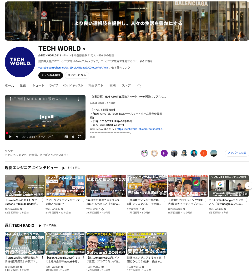 株式会社テックワールドは、チャンネル登録者数11万人と国内最大級のフォロワーを抱える、ITエンジニア向けYouTubeメディアを運営しています。