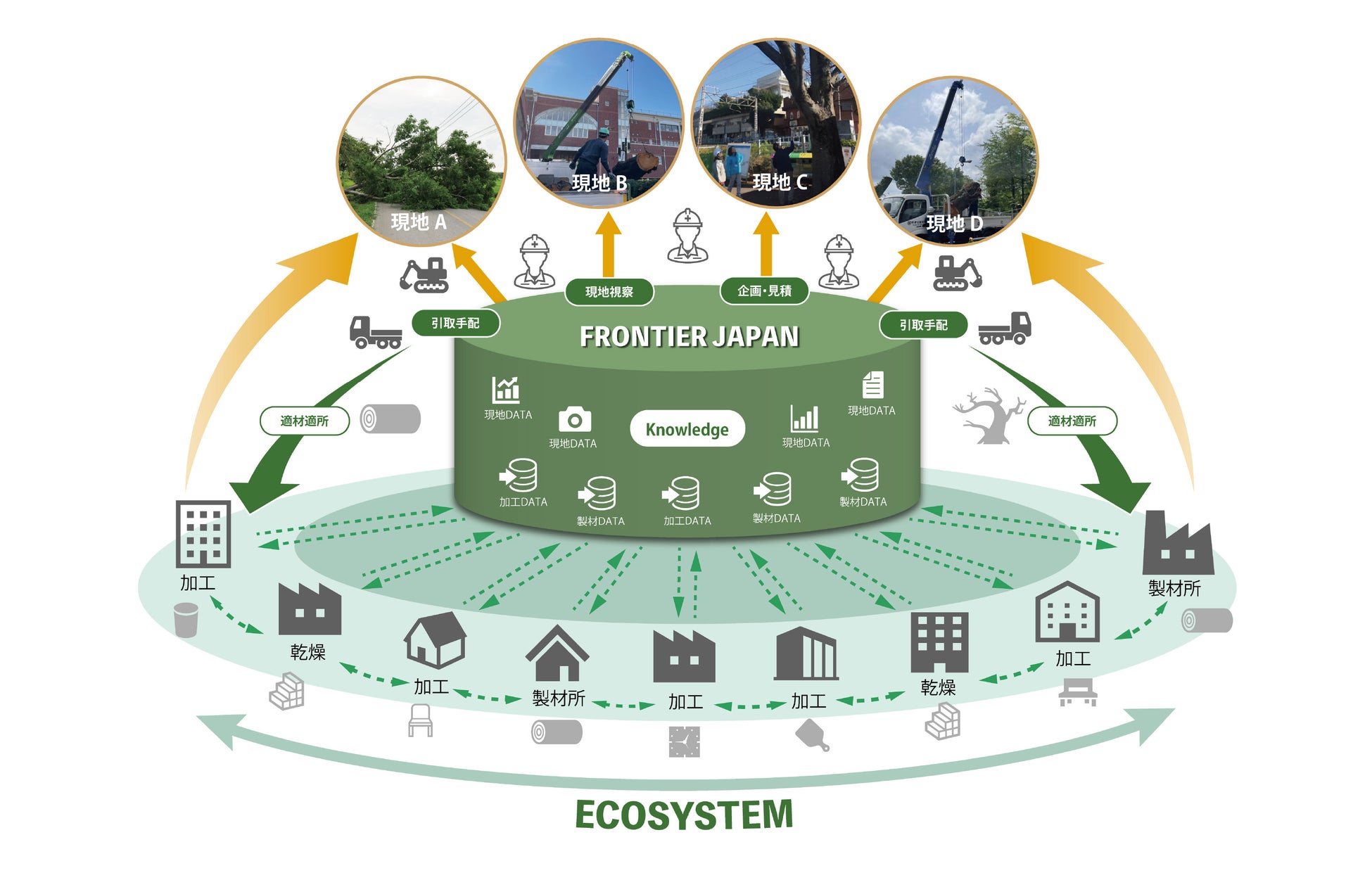 国産材活用のプロダクトメーカーとして、長年培った技術やエコシステムを活かし、調査・運搬・加工・商品化・納品までワンストップ対応する「伐採木活用による新たな都市型林業ビジネススキーム」を構築。