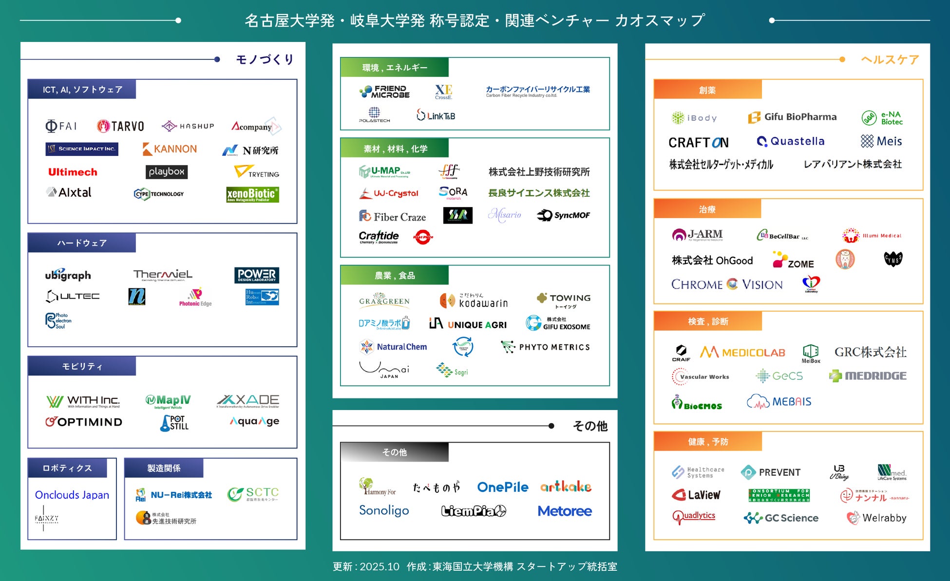また本サイトでは、外部企業やベンチャーキャピタル(VC)向けに、名古屋大学・岐阜大学発のベンチャー企業を分野別に整理した「大学発ベンチャー・カオスマップ」を新たに公開。分野ごとの企業群が可視化され、産学官連携の促進や投資検討の一助となることを期待しています。