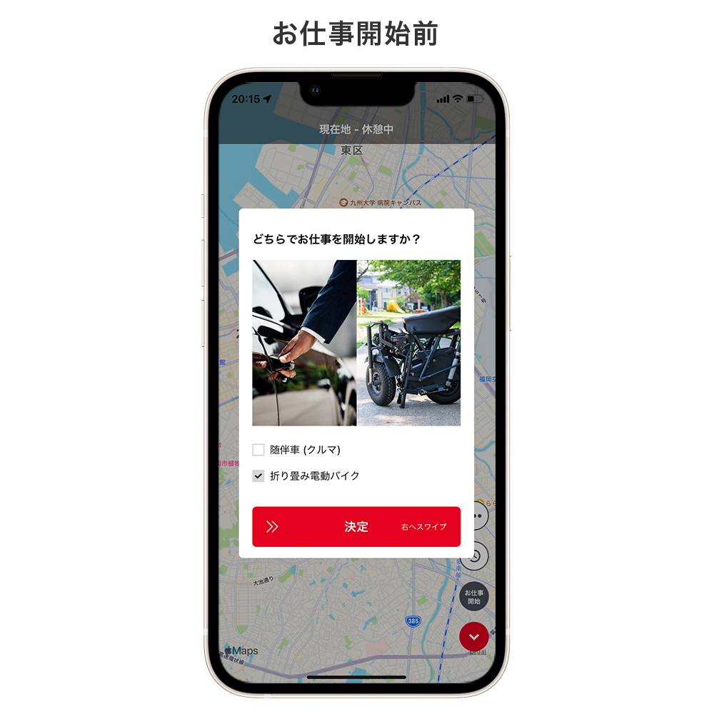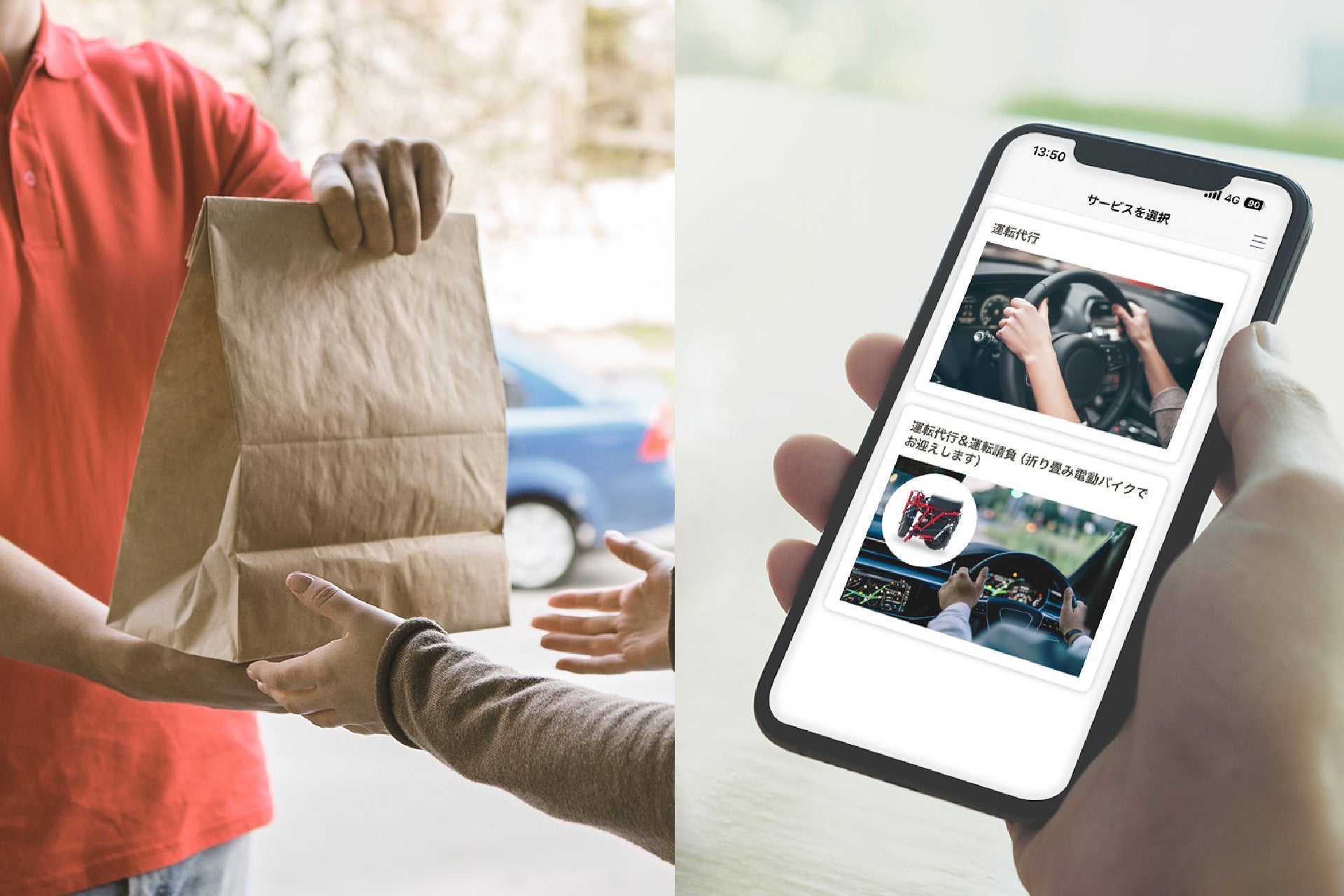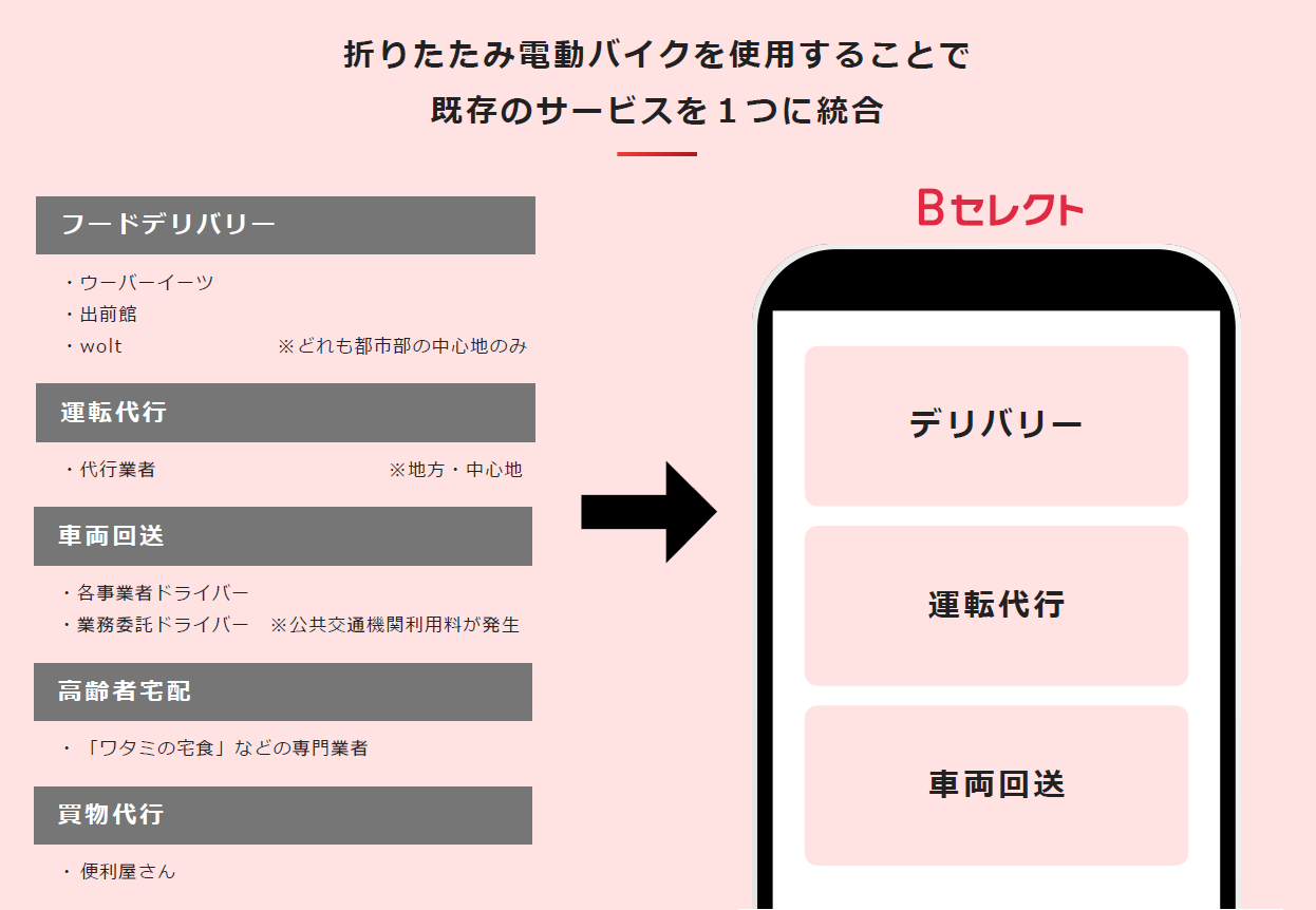 折りたたみ電動バイクを活用することで、飲食店スタッフが自ら代行運転を行い、帰りはバイクで店舗へ戻るという効率的な仕組みを実現します。また、アプリ「Bセレクト」では宅配デリバリーの受注機能も搭載。