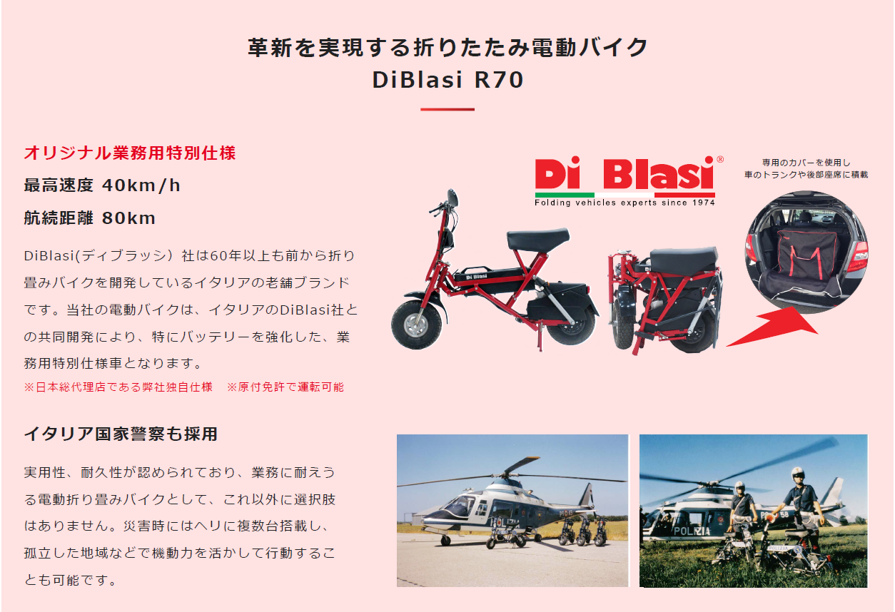 当時の折りたたみ電動バイクは、イタリアのDi Blasi社と共同開発し、日本での業務使用に耐えうる特別仕様車を開発。