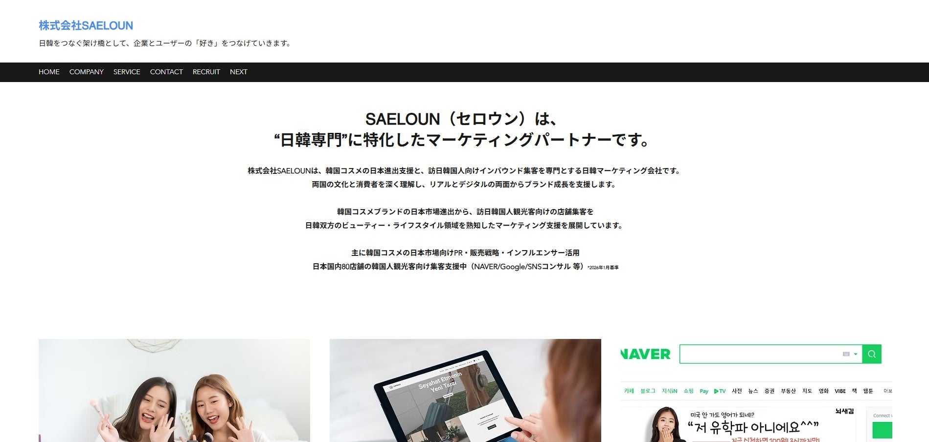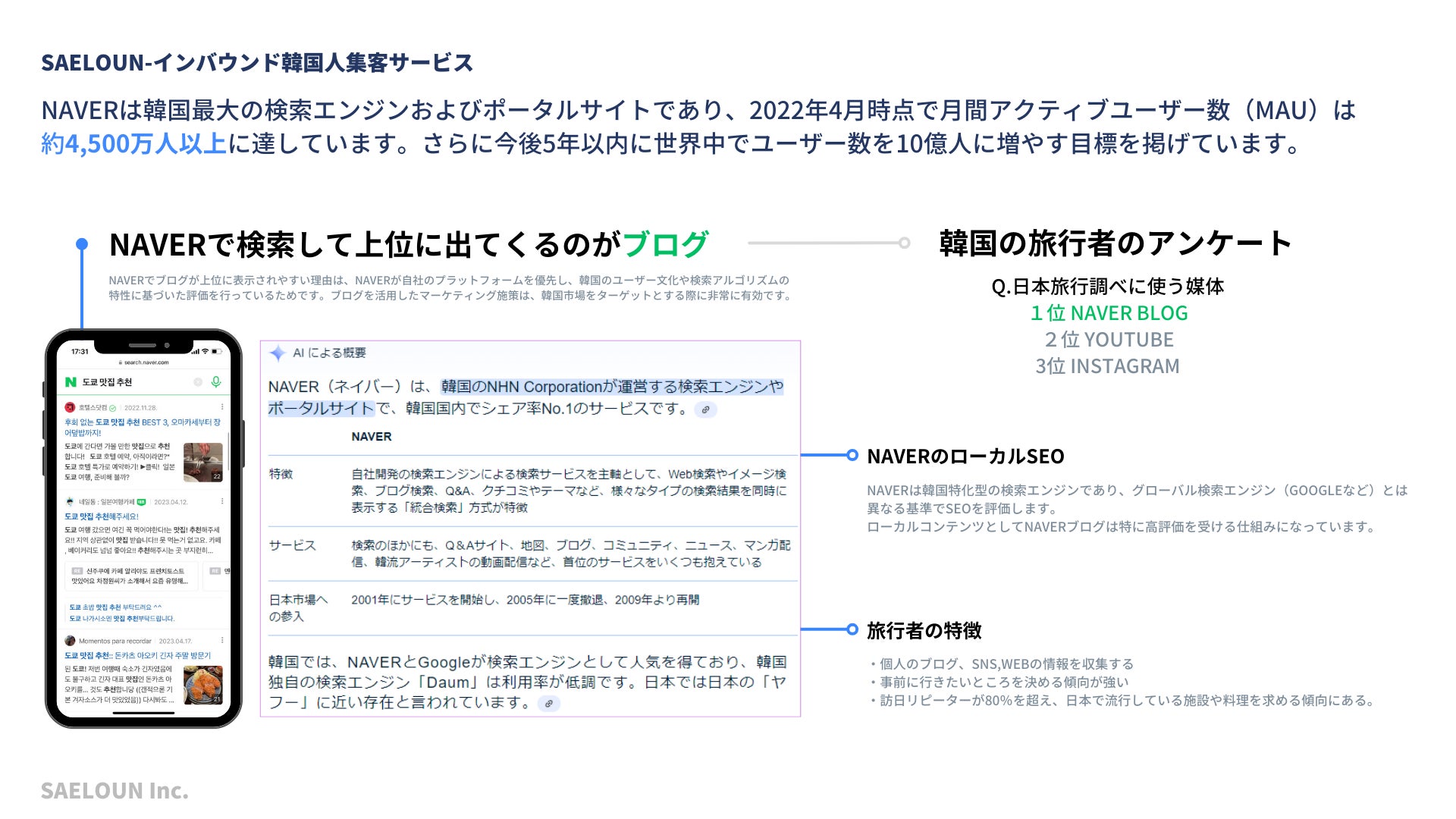 SAELOUNは、こうした課題に対し、韓国人が実際に旅行前に利用する検索・情報収集導線に着目し、NAVERを起点とした集客支援サービスを提供しています。