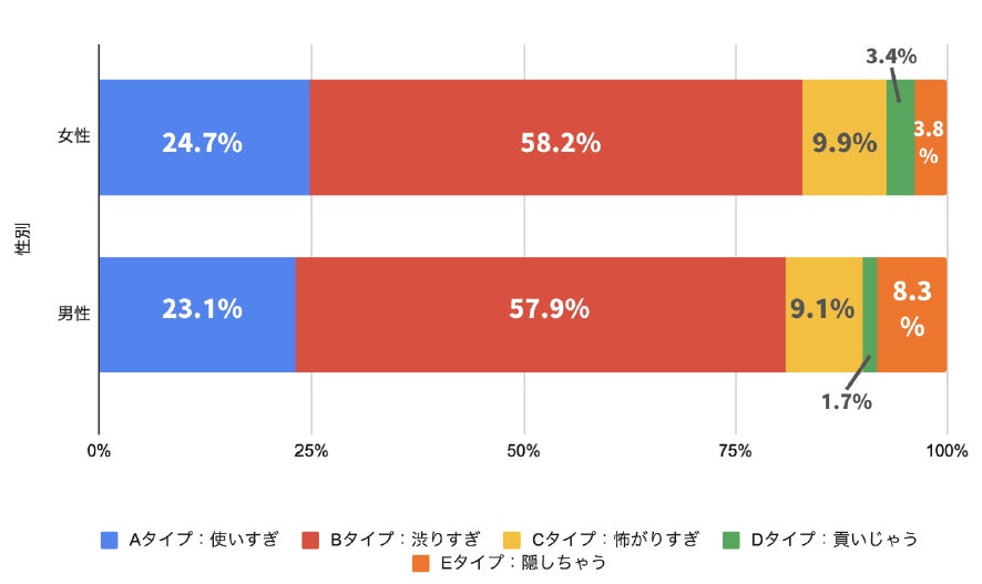 男女ともに最多は「渋りすぎ」タイプですが、女性は「使いすぎ」がやや高く、感情や共感に基づく消費行動が見られます。SNSや“推し活”などの文化が購買意欲を刺激し、支出に直結している傾向があります。一方、男性では「隠しちゃう」傾向が相対的に高く、家族や社会との距離感、責任感と自由のバランスを取ろうとする心理が背景にあると考えられます。