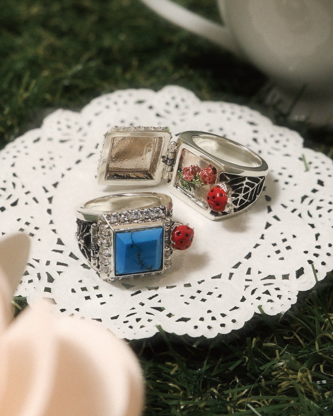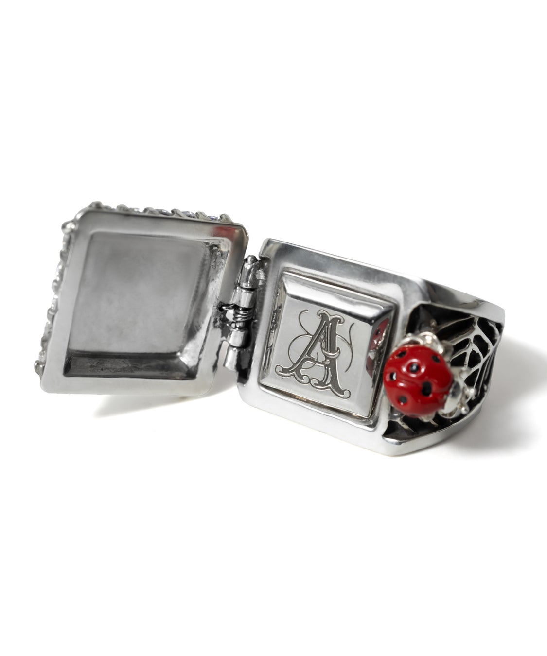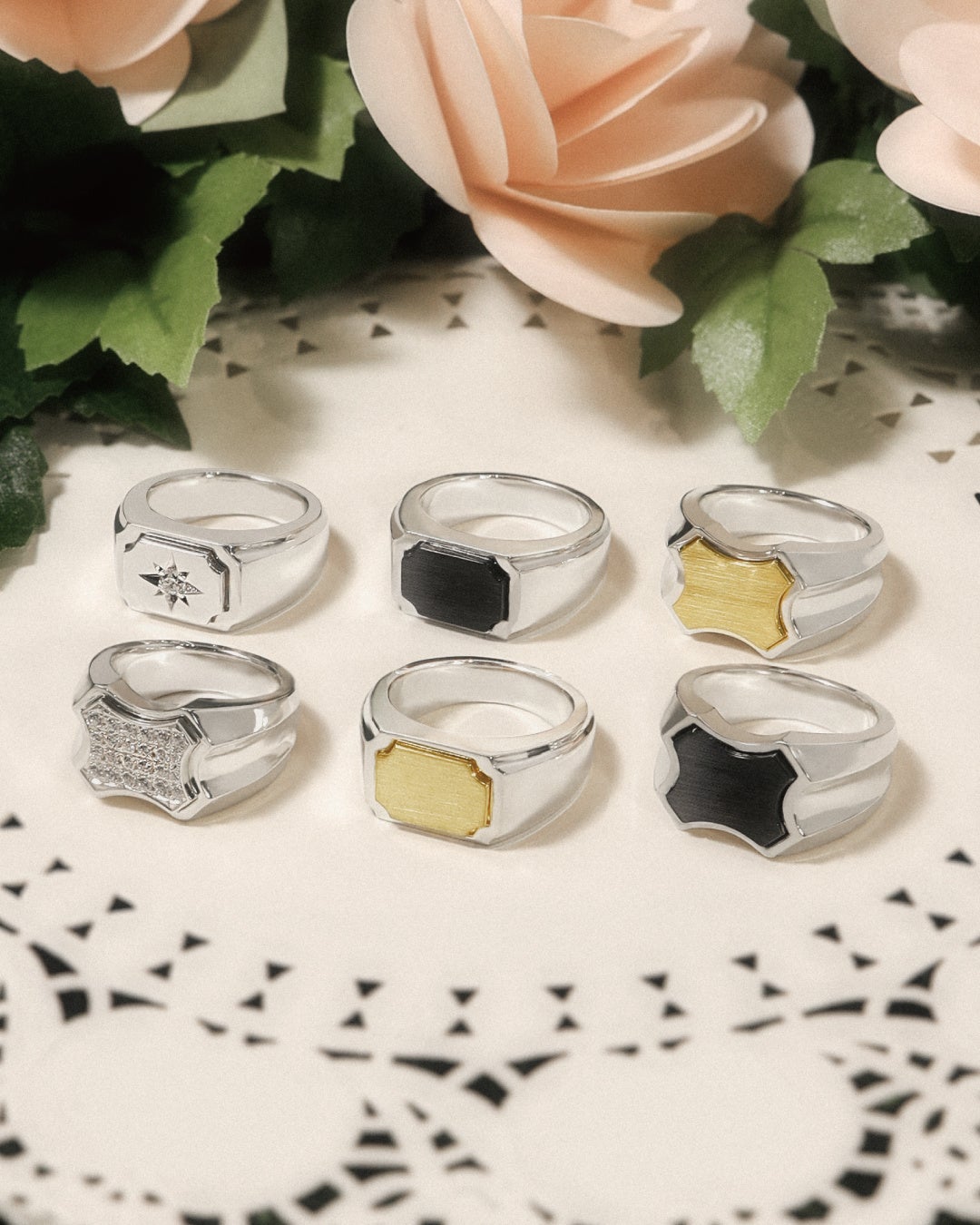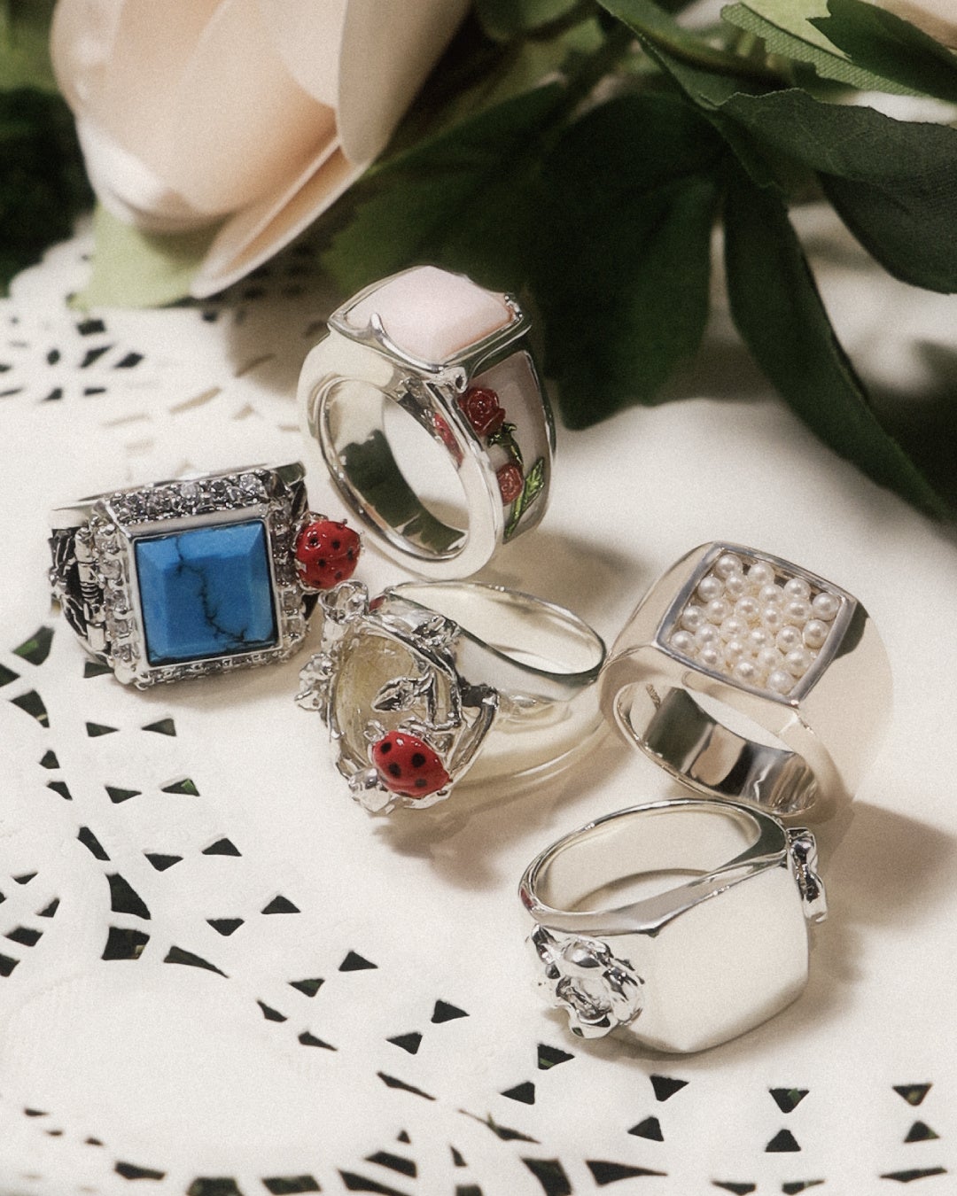 カレッジリングのフォルムをかたどったデザインは、メンズのスタイリングの差し色にも。