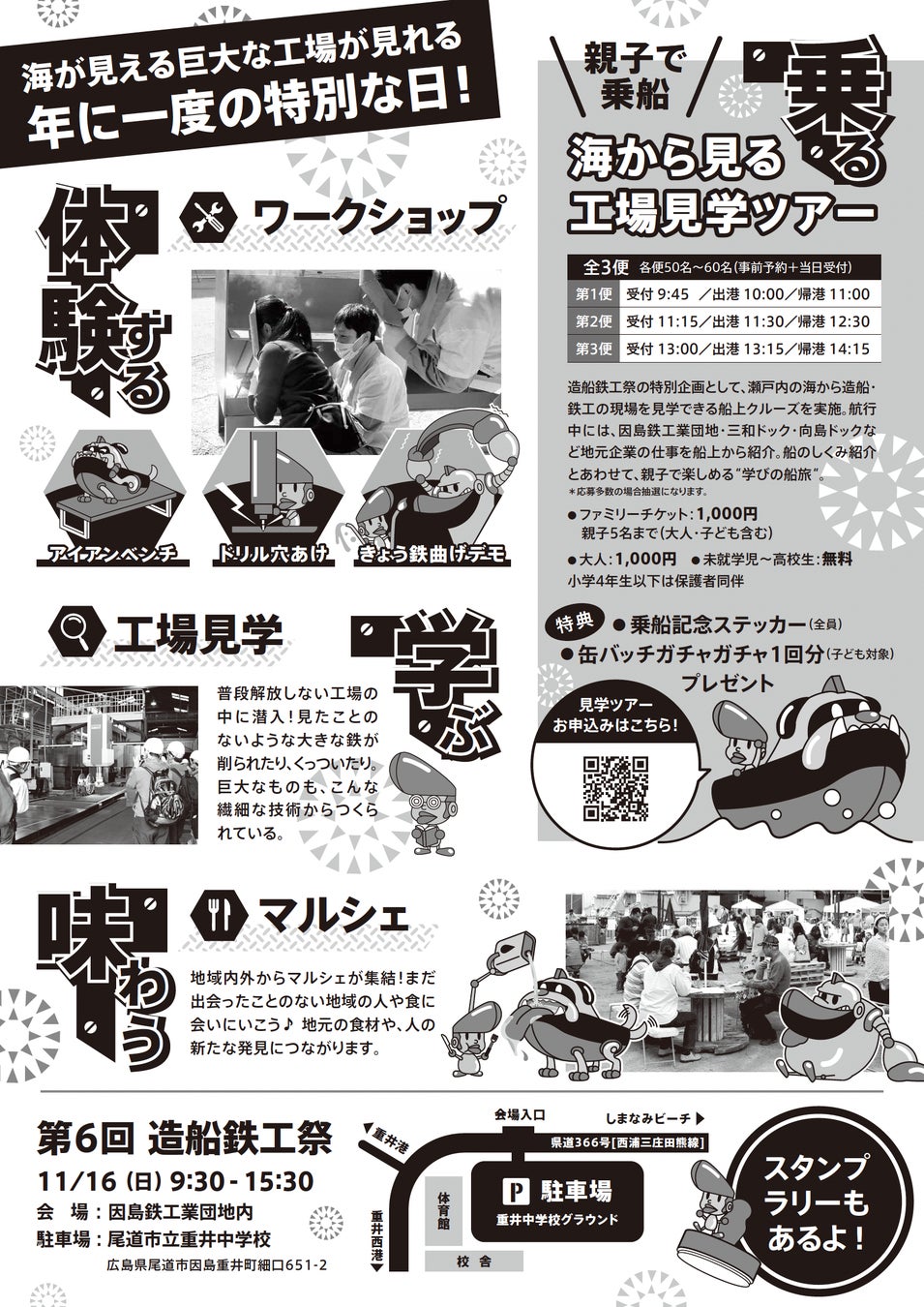 尾道市の造船・鉄工関連企業を中心に、地場産業の魅力を体感できるイベント「造船鉄工祭2025」を、2025年11月16日(日)に開催します。会場は因島鉄工業団地協同組合の敷地内および三和ドック敷地内。尾道を代表する企業が業種やエリアを越えて集い、ものづくりの現場を公開します。