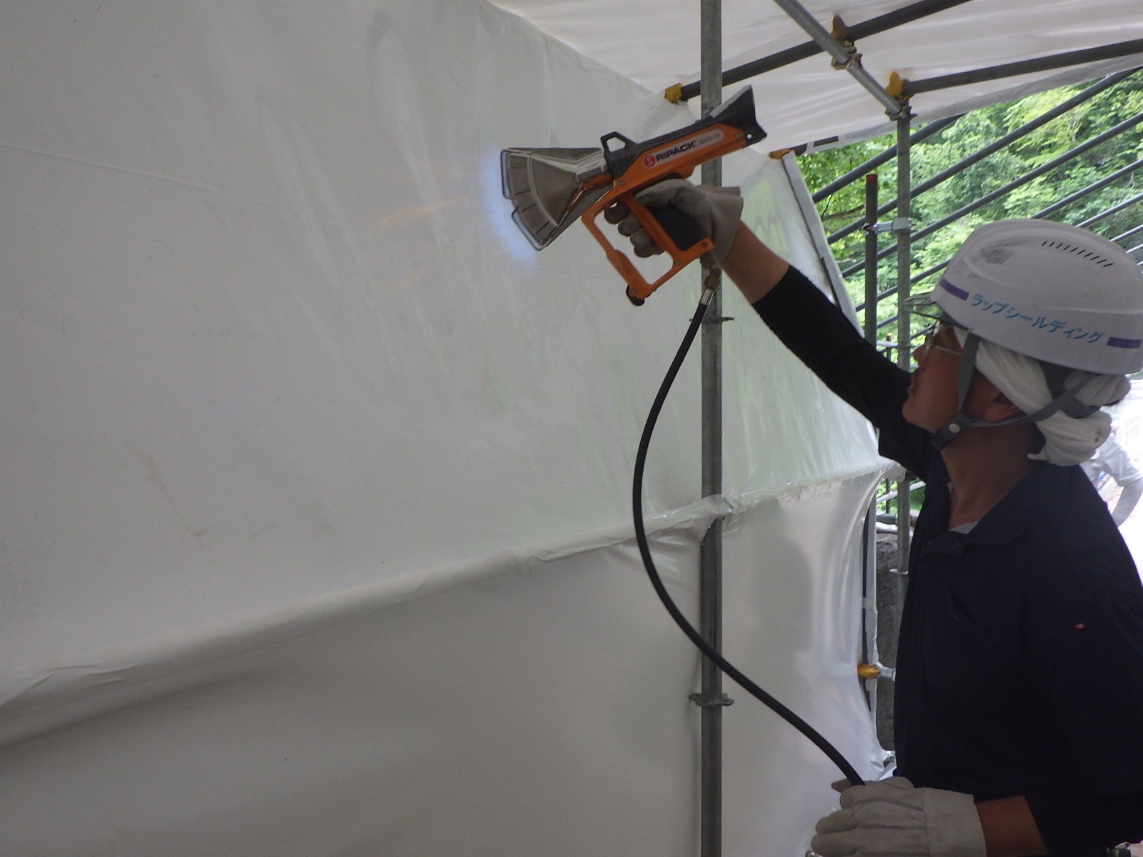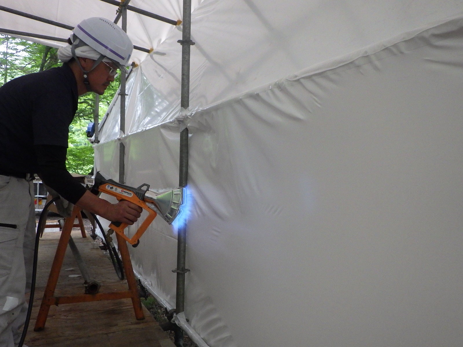 熱で“ピタッ”と縮んで密封する専用フィルムで、対象や作業区画を包む養生です。