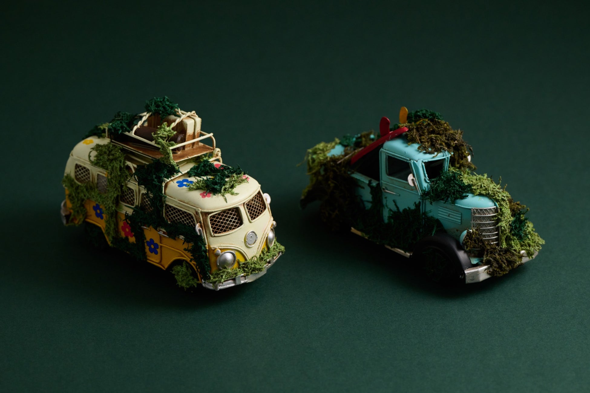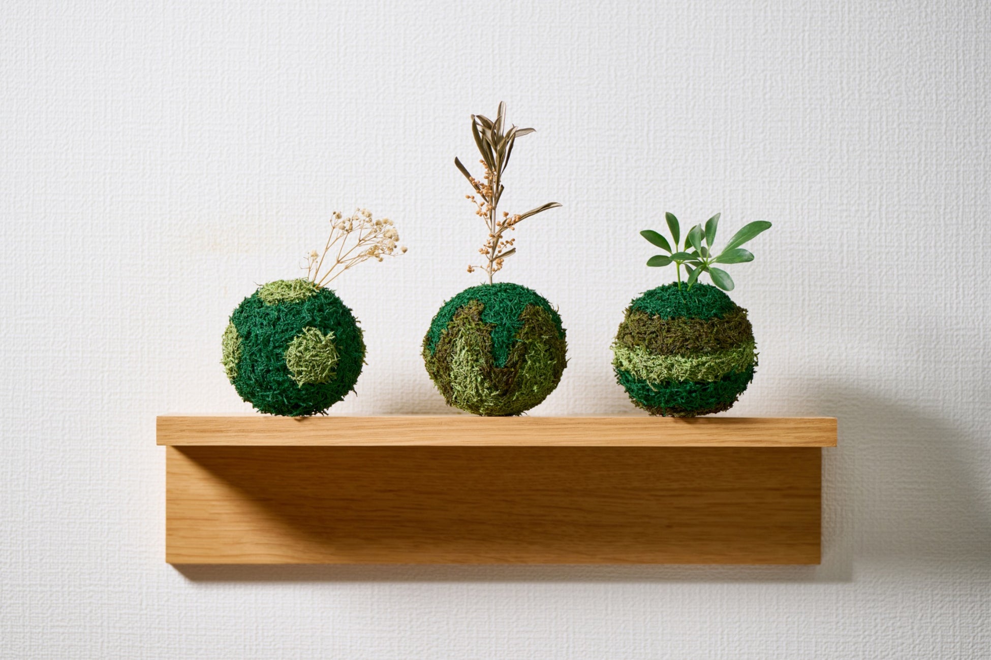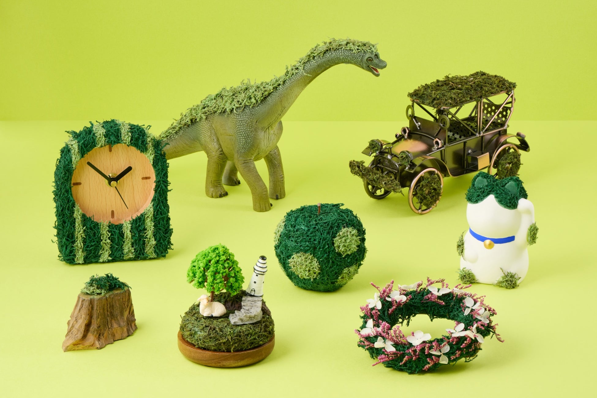 コケヌルを丸めて小さなコケ玉をつくったり、植木鉢や瓶を彩ったり。雑貨や模型の仕上げはもちろん、インテリアやアート、DIYなど、自由な発想で新たな表現を探求してください。