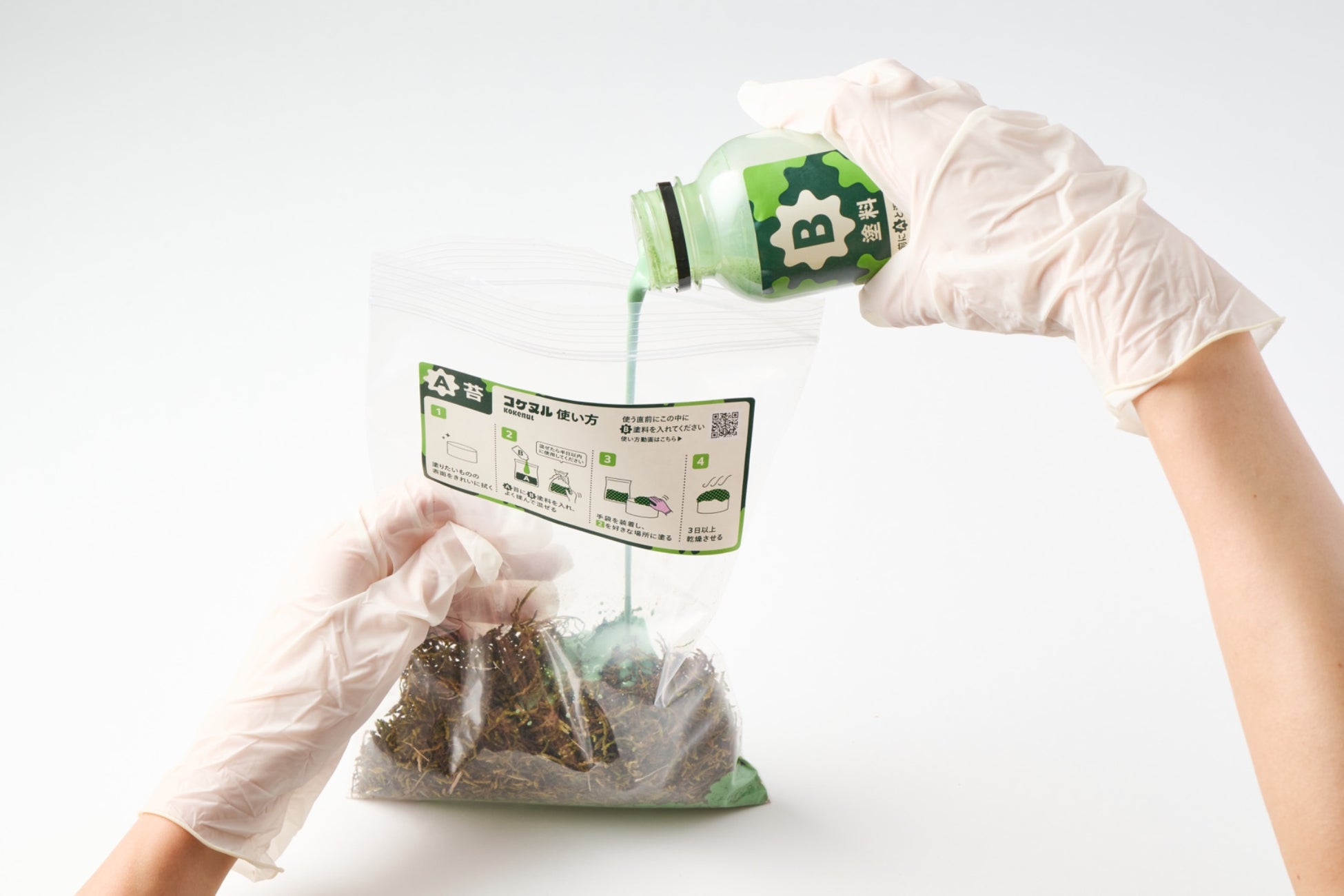 そんな日研が今回初めて一般消費者向けに開発したのが、生きたコケを原料にした植物塗料「コケヌル」です。この塗料は、「いつか尽きるものではなく、200年後も残る塗料をつくりたい」といった思いから開発がスタートしました。一般的な塗料が石油由来の樹脂を原料としているのに対し、コケヌルの原料は約50%が日本で栽培されている生きたスナゴケです。