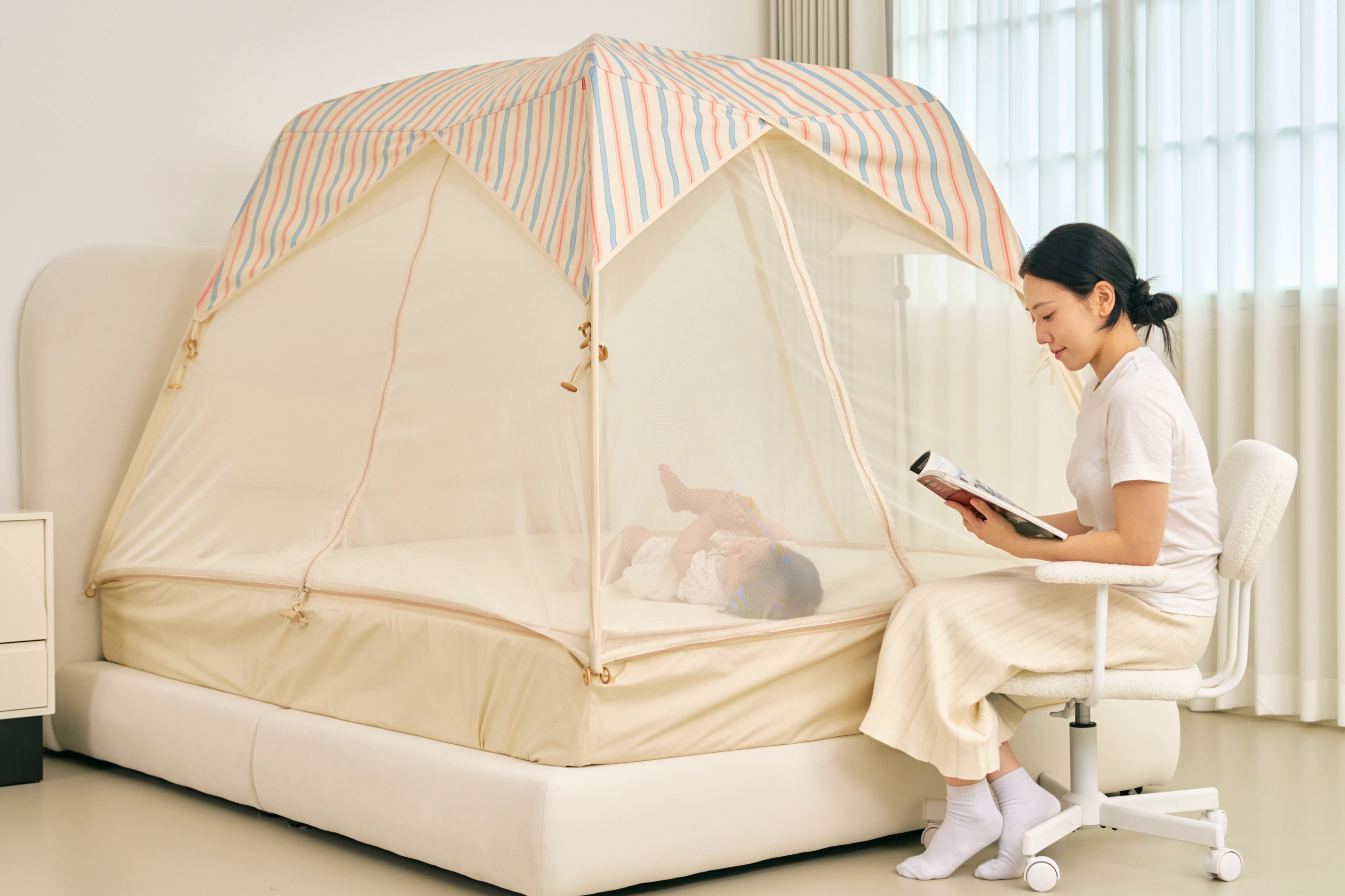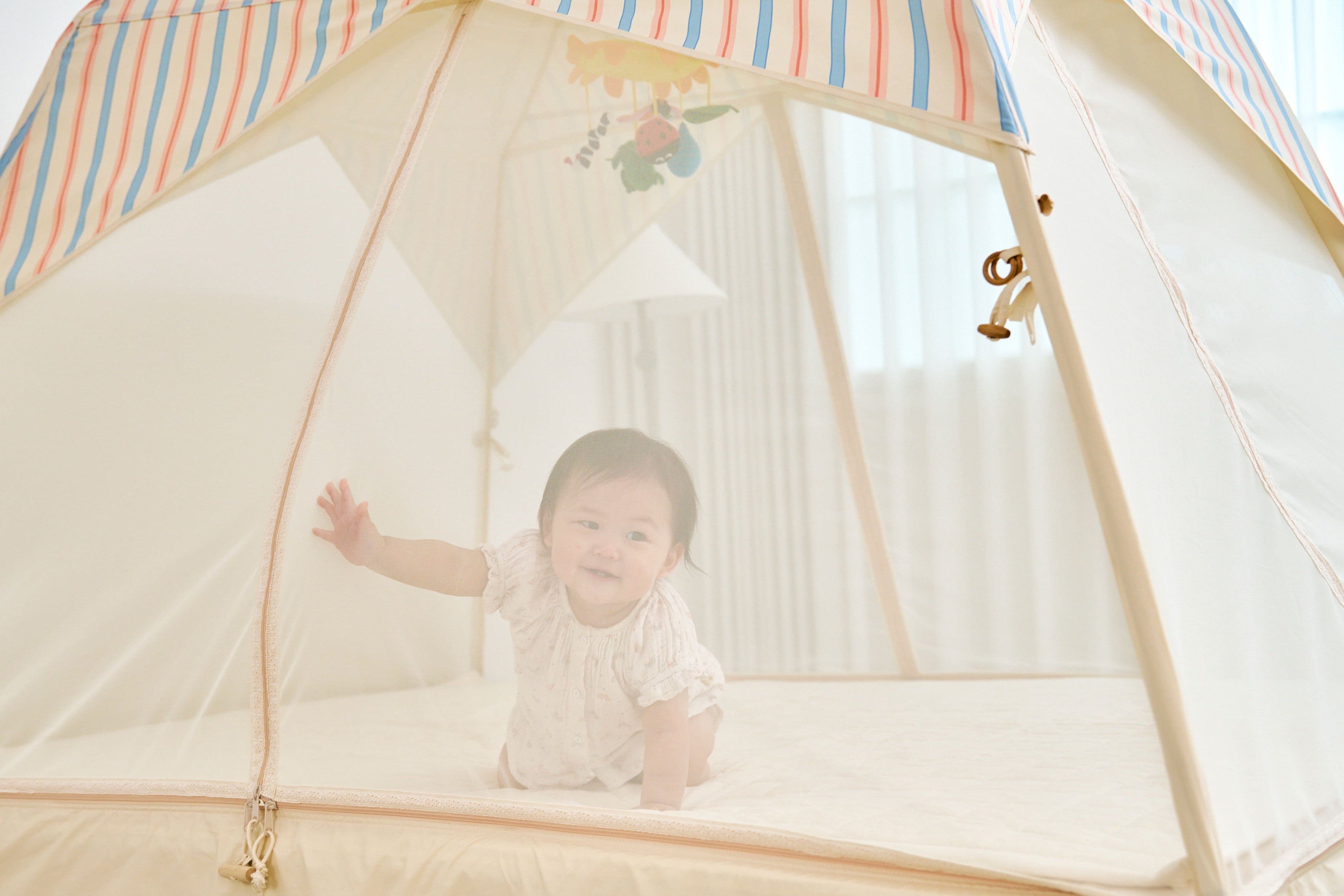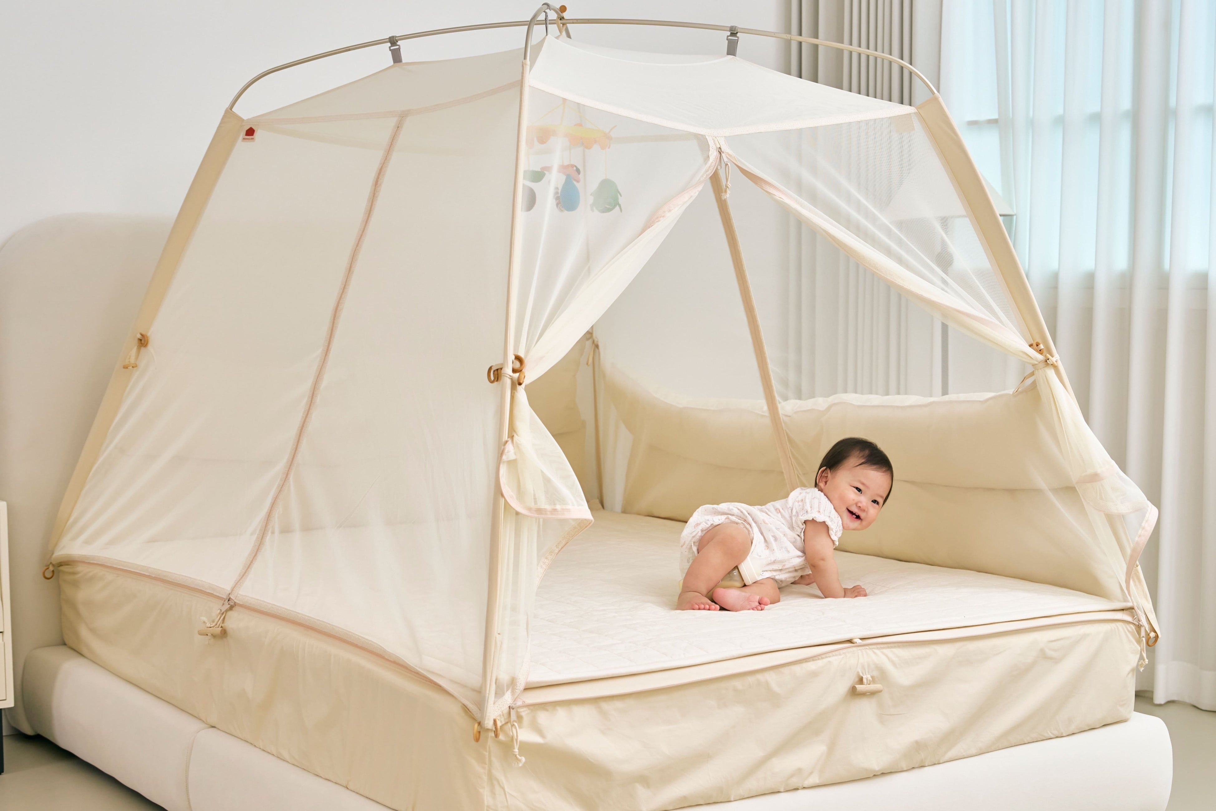 韓国で生まれたベッドの上に設置するテント型ベッドガードという新しいかたち。テントのように全体を包み込む設計で、ママとパパにとっては安心の空間に。子どもにとっては秘密基地のような空間に。
