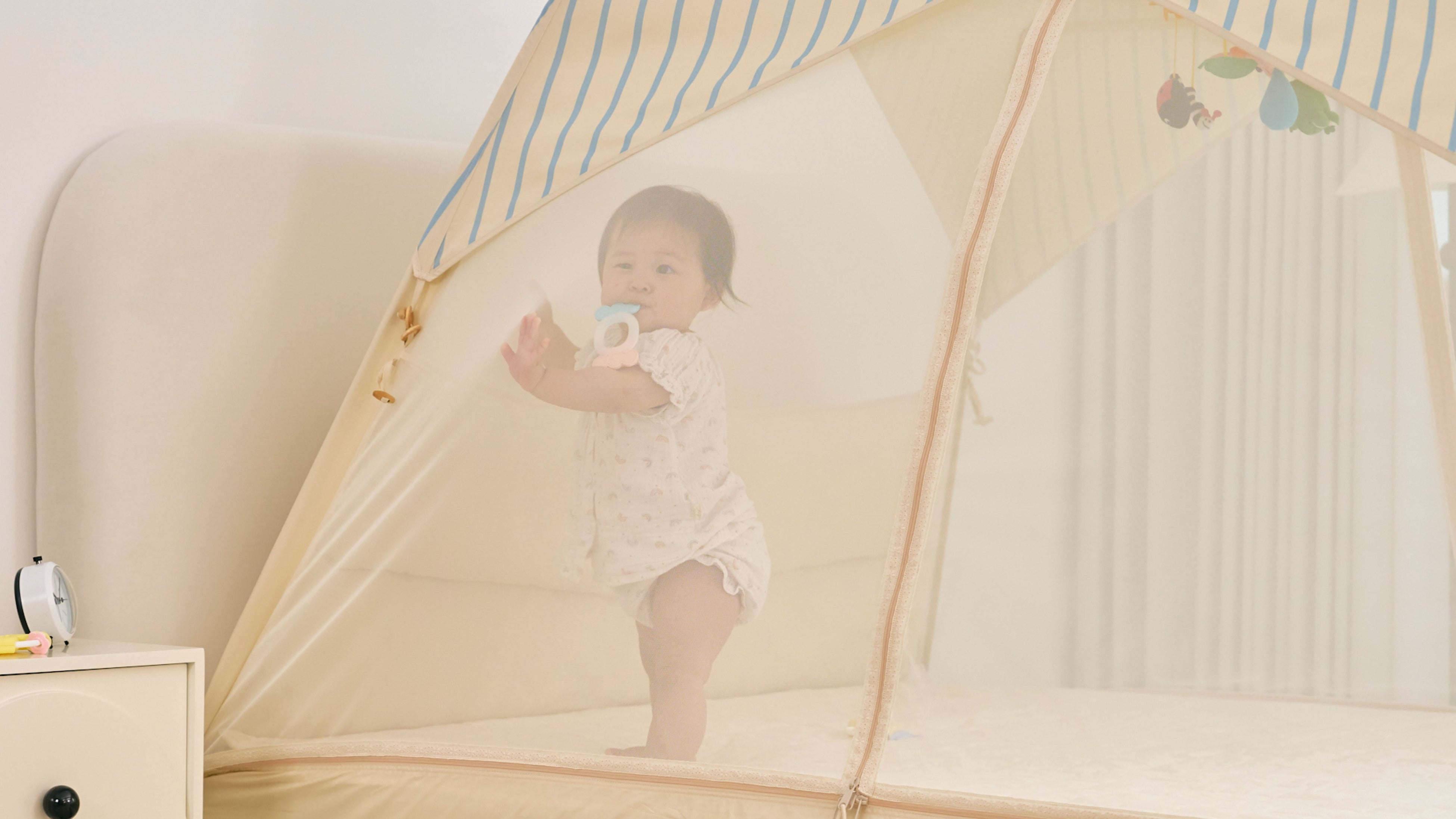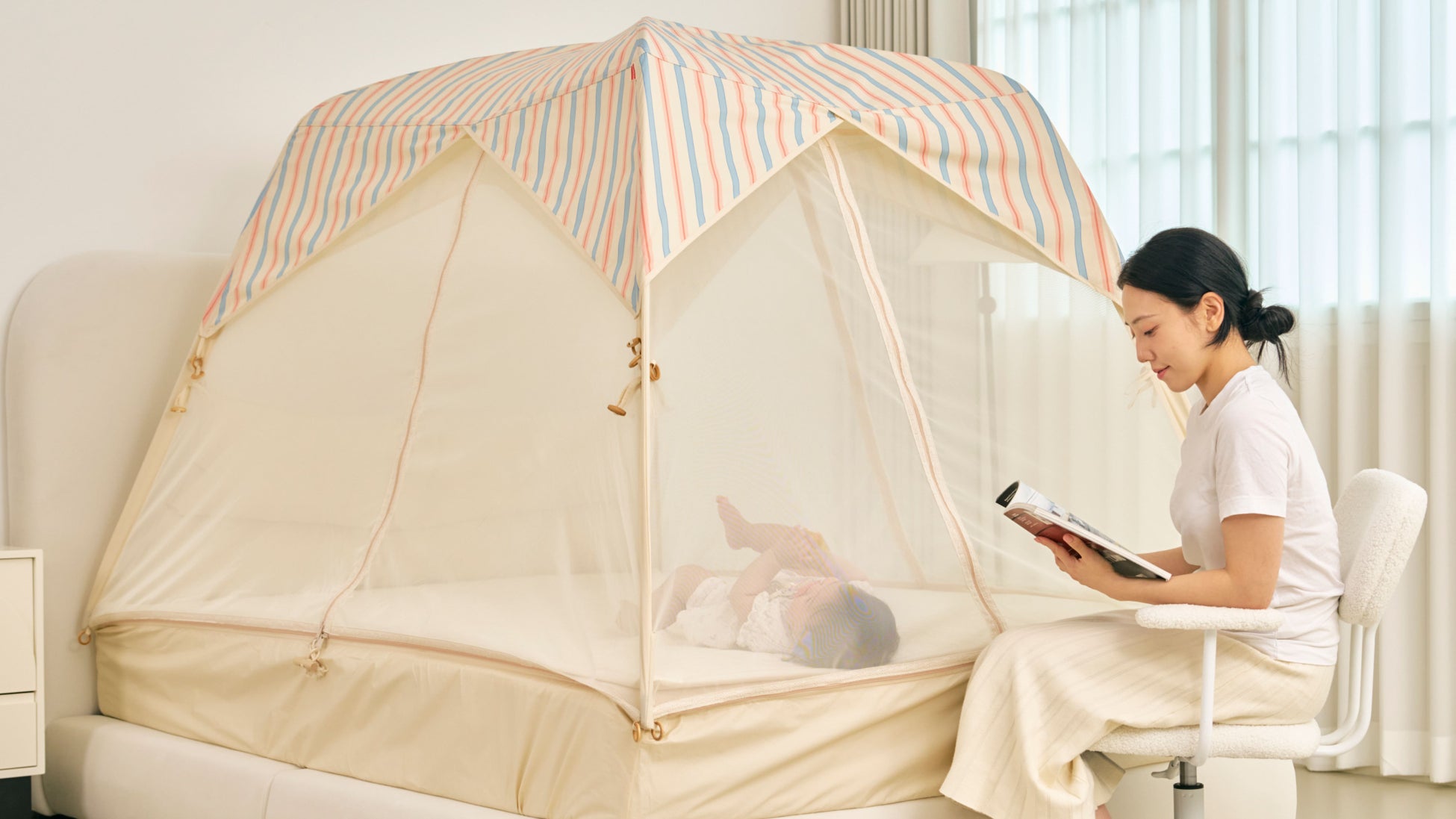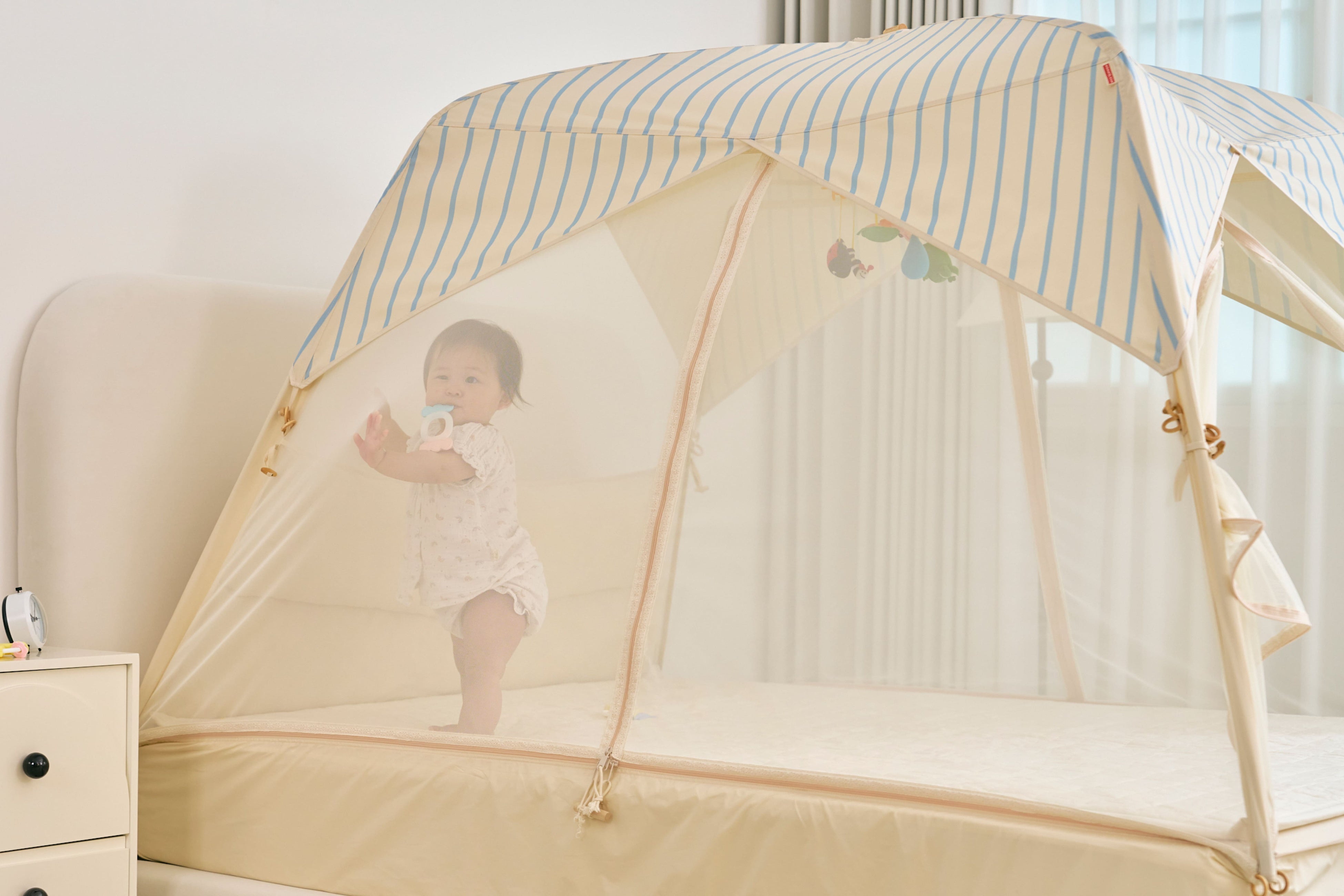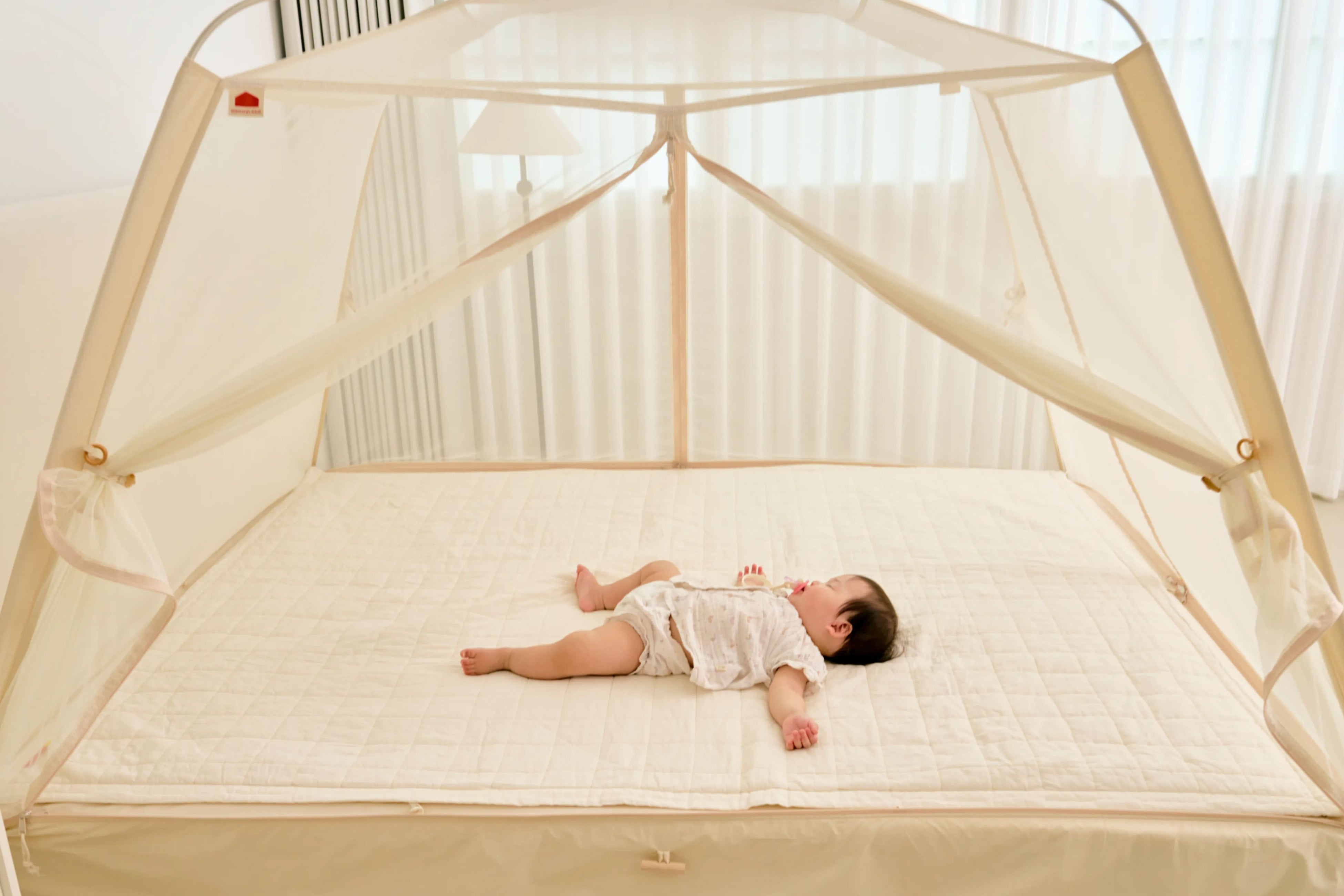 韓国で生まれたベッドの上に設置するテント型ベッドガードという新しいかたち。テントのように全体を包み込む設計で、ママとパパにとっては安心の空間に。子どもにとっては秘密基地のような空間に。