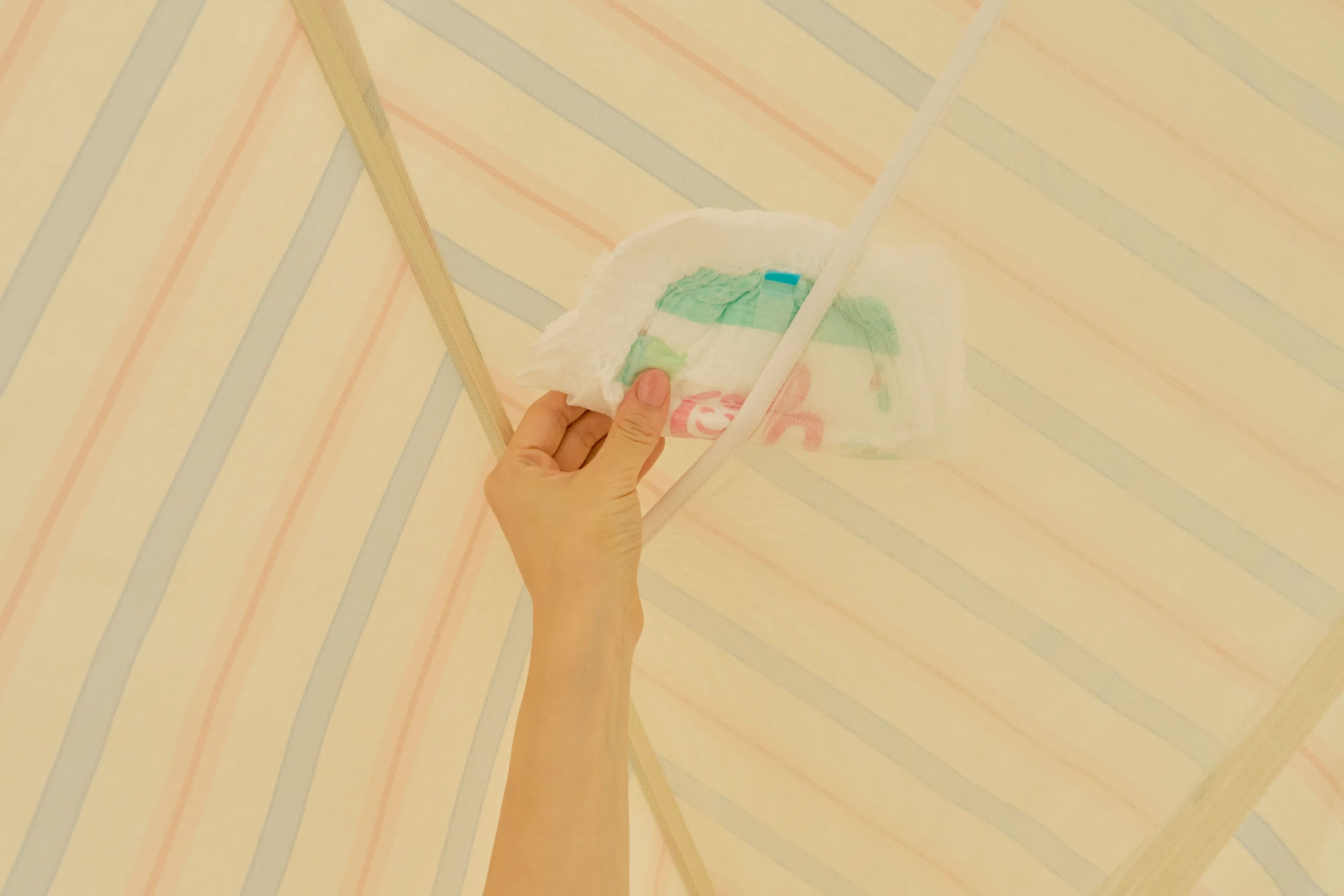 マットレス下にカバーを潜り込ませるように装着するので、約20kgのマットレスの重みで商品が安定します。子どもが押してもテントは倒れにくい構造になっています。