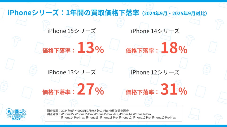 iPhone15シリーズは2024年9月から2025年9月にかけて、買取価格下落率が13%だったのに対し、iPhone13シリーズの買取価格は27%下落、iPhone12シリーズは1年間で30%以上、買取価格が下落していることが分かりました。