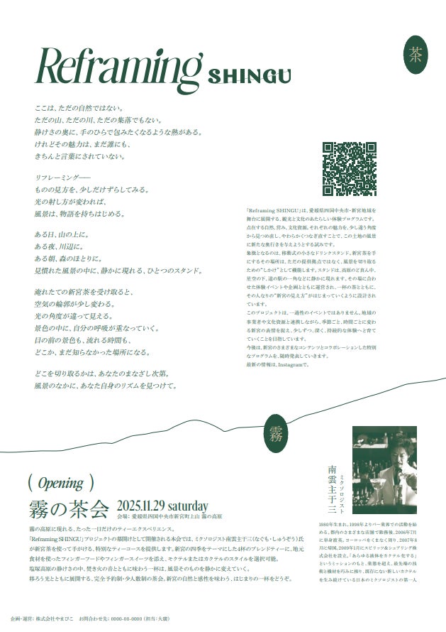 [株式会社やまびこ](本社:愛媛県四国中央市新宮町馬立4491-1)は、四国中央市新宮地域の豊かな自然、歴史文化、そして地域固有の魅力を「Reframing(リフレーミング)」という新たな視点で見つめ直し、持続的な地域価値の創出を目指すプロジェクト「Reframing SHINGU」を本格的に始動します。