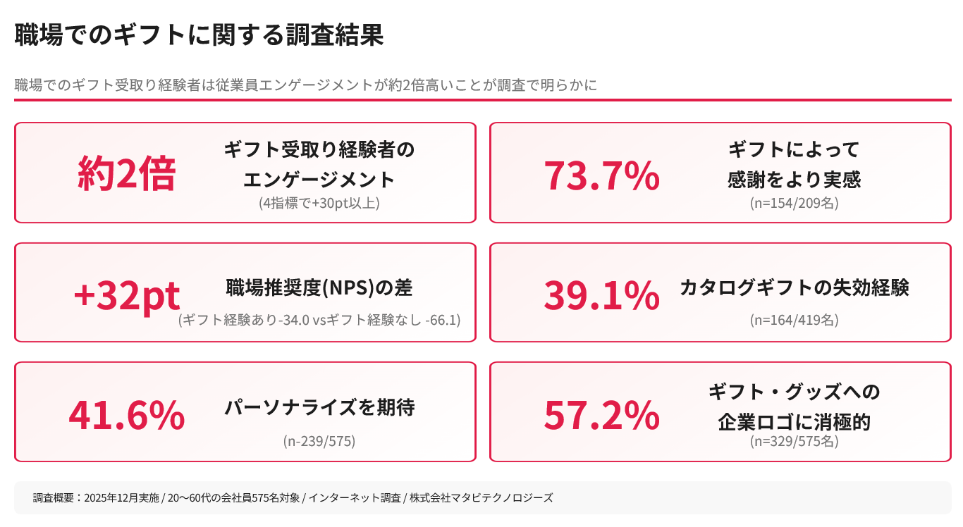 従業員向けギフト代行プラットフォームの開発・運営を行う株式会社マタビテクノロジーズ(本社:東京都港区、代表取締役:植野 力)は、会社員575名を対象とした「職場ギフトと従業員エンゲージメントに関する調査」を実施いたしました。その結果、職場でギフトを受け取った経験のある従業員は、経験のない従業員と比較して、エンゲージメントに関連する4つの指標において約2倍(30ポイント以上)高いスコアを示しました。