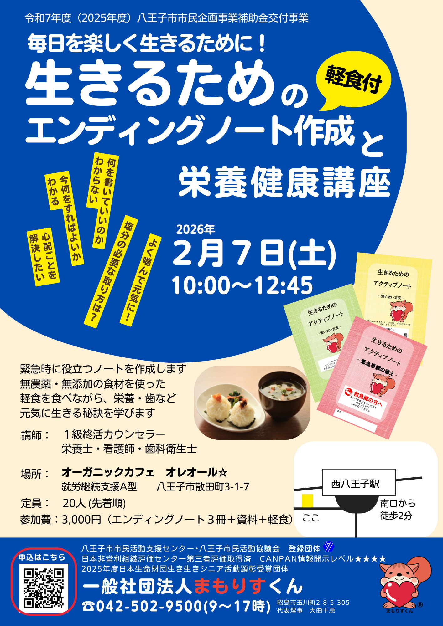 非営利型一般社団法人まもりすくん(昭島市玉川町2-8-5-305、代表理事:大曲千恵)は、令和7年度(2025年度)八王子市市民企画事業補助金交付事業として終活講座を開催します。この講座では、3冊に分かれたエンディングノートを活用し場面にあったノートの必要性をお伝えします。
