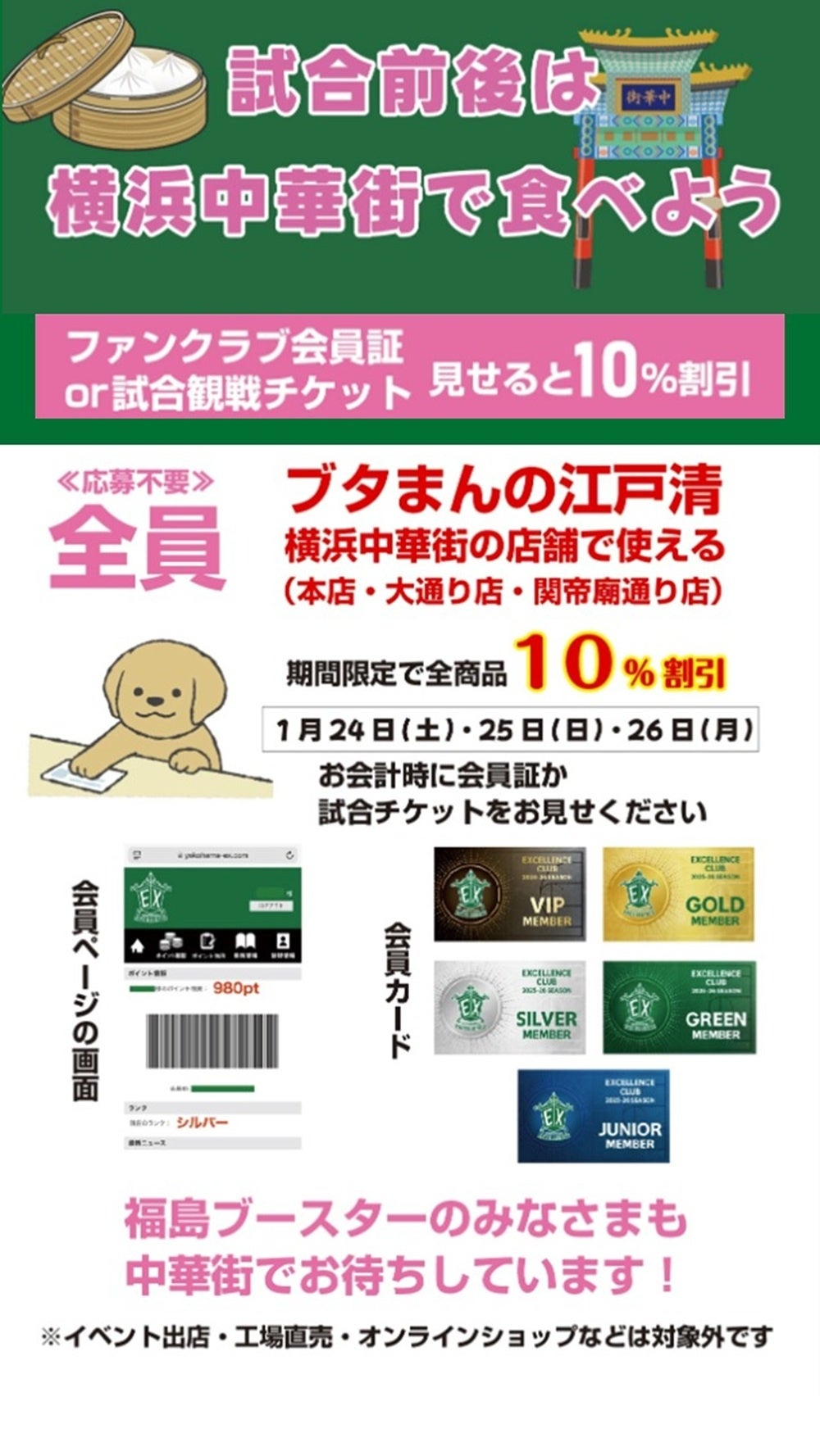 「試合観戦チケット」または「横浜エクセレンス会員証」を見せると10%OFF