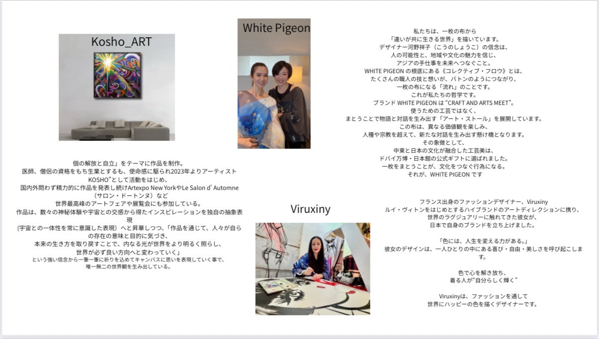 ブランド WHITE PIGEON は “CRAFT AND ARTS MEET”。使うための工芸ではなく、まとうことで物語と対話を生み出す「アート・ストール」を展開しています。この布は、異なる価値観を楽しみ、人種や宗教を超えて、新たな対話を生み出す懸け橋となりす。