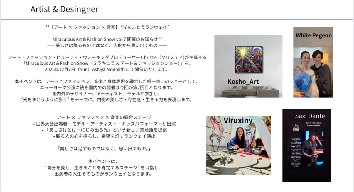 Art x Fashion x Music and Support for Women Miraculous aims to create new value by fusing technology with art, fashion, and music! At the same time, we provide multifaceted support so that women can shine with their individuality and talents and become independent and soar in society.