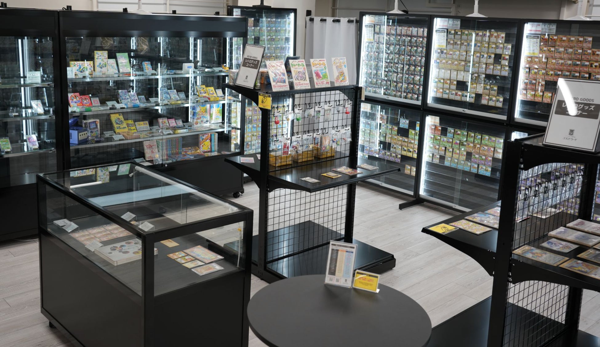 移転前の店舗と比べて販売スペースを3倍以上に拡大。20年以上前のポケモンカードを一堂に展示しております。
