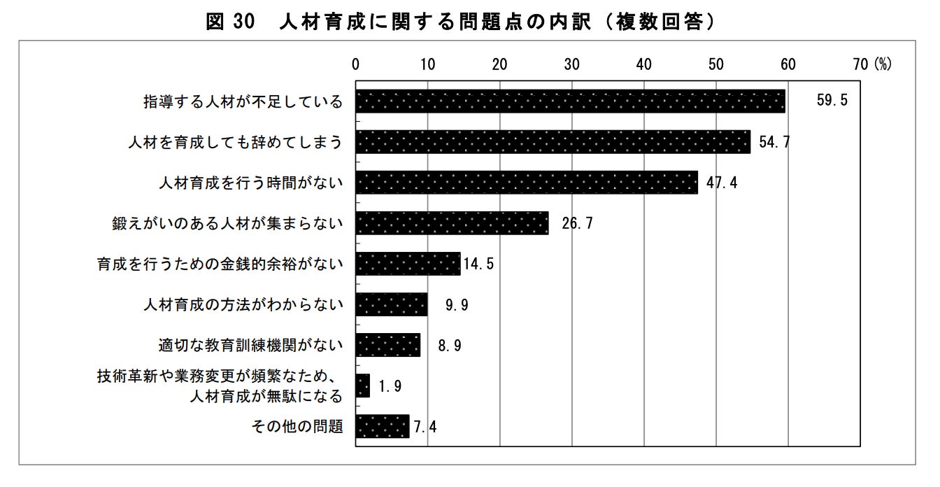育成は“仕組み”不足:法人事業所の79.9%が人材育成に「何らかの問題」ありと回答。内訳は「指導する人材が不足(59.5%)」が最も高く、続いて「育成しても辞める(54.7%)」「育成の時間がない(47.4%)」が上位にあがっています。