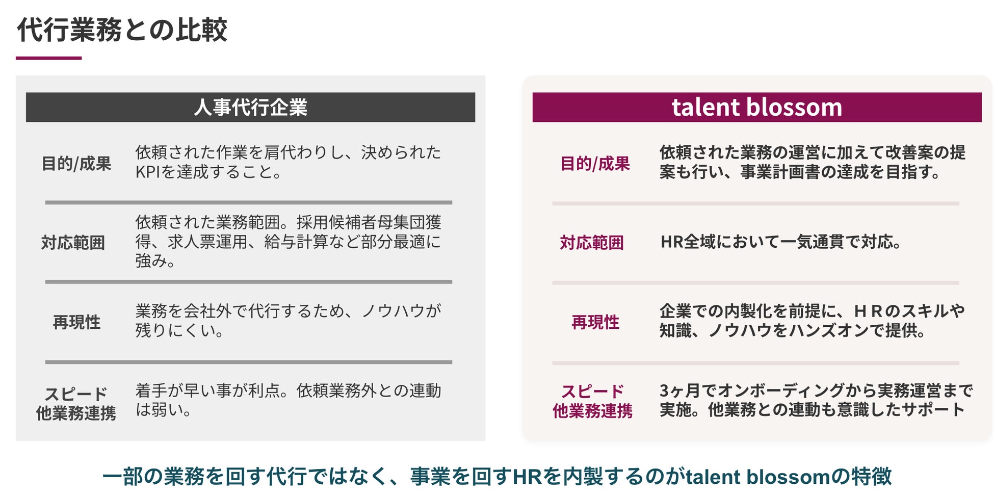 本サービスが目指すのは“永続的な外注”ではなく内製化の完了です。実務を並走しながらノウハウ・マニュアル・運用の核を移転し、契約終了後も成果が出続ける状態を残します。そのために、採用・育成・評価・労務を個別最適にとどめず、最短3カ月で“つながった人事”を社内に定着させ、事業の実行速度を上げる——それがtalent blossomです。