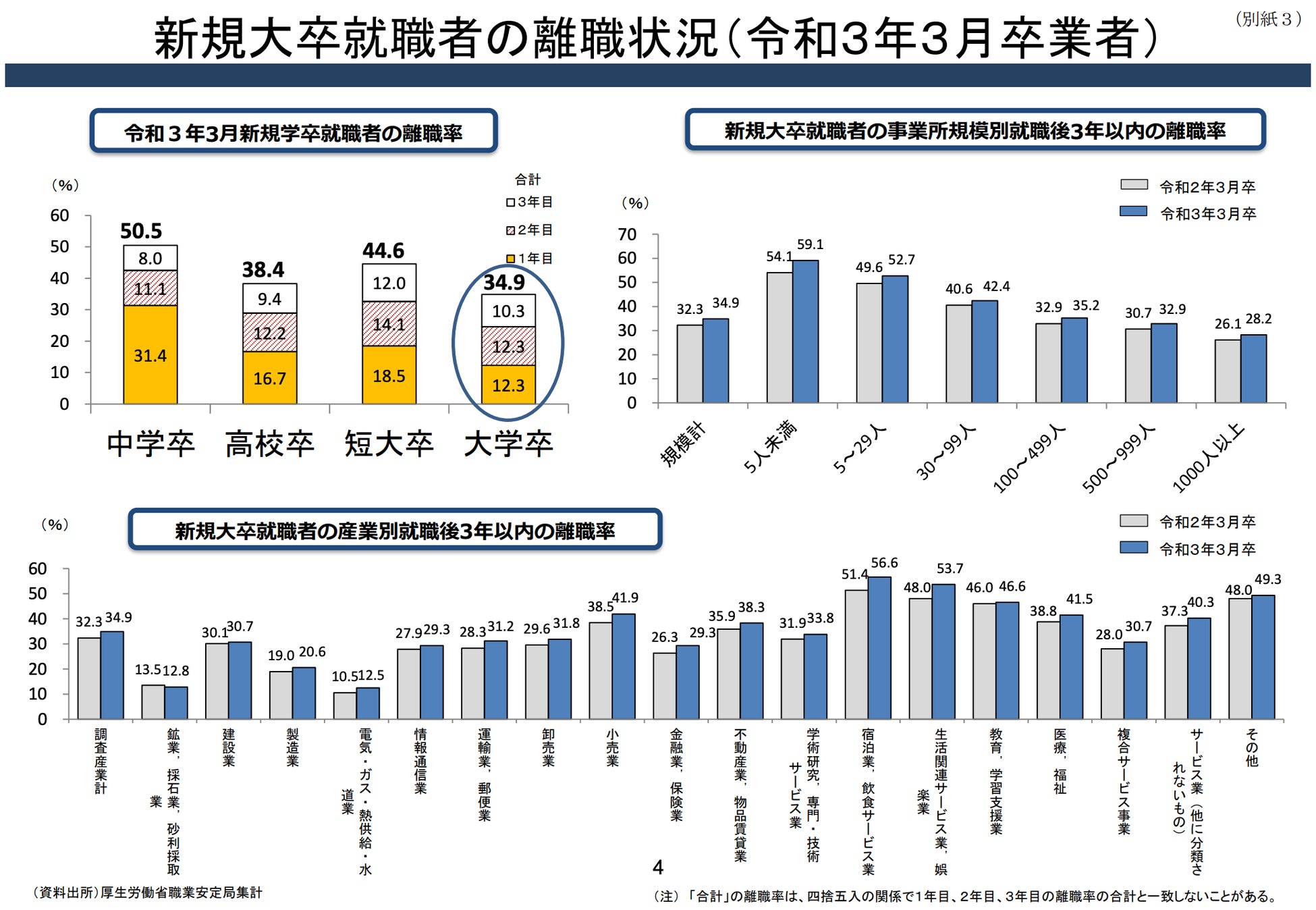 “3年3割超”の定着課題:新卒大卒34.9%が3年以内に離職(令和3年3月卒の追跡)。前年卒業者と比較しても2.6%の増加。新卒者の育成~部門配置~評価までの連携が問われています。