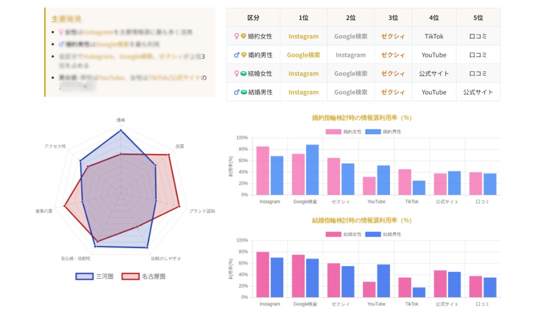 既存顧客へのインタビューを通じて、数字だけでは見えない「購買に至るまでの心の動き」や顧客行動、購買決定要因を明らかにします。さらに定量アンケート調査やWebサイト・広告分析で仮説を検証し、確度の高いインサイトを導き出します。
