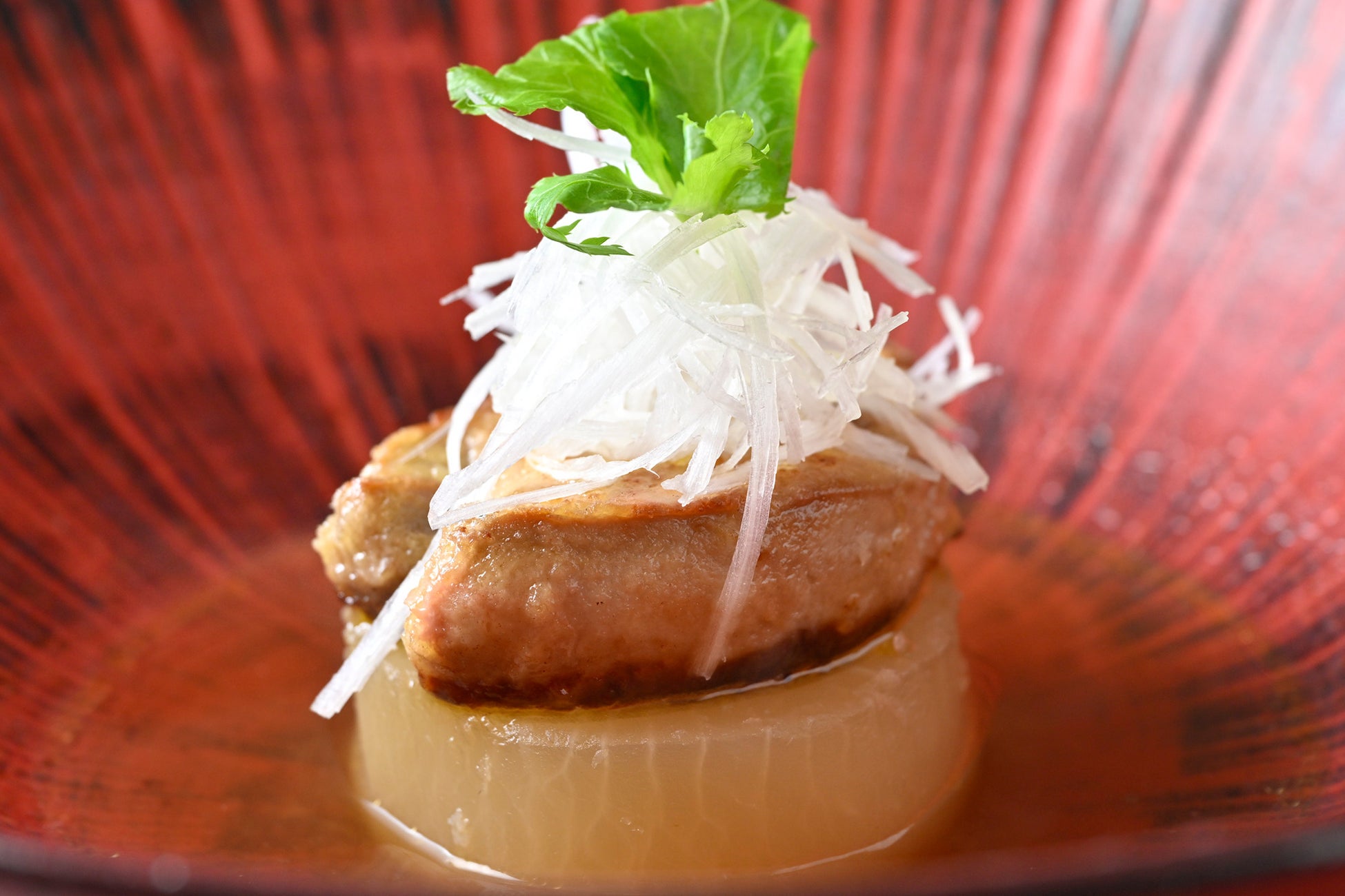 フォアグラのポアレと大根の和風出汁仕立て:和風出汁に濃厚フォアグラが意外とマッチする一皿