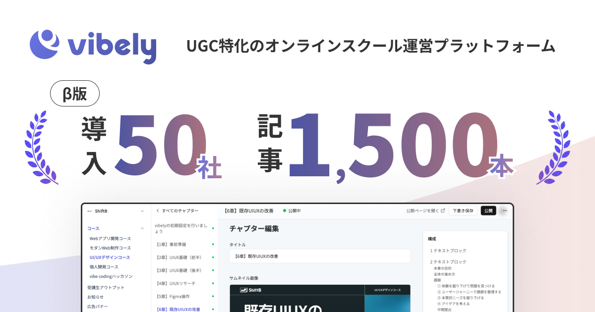 受講生のコンテンツ発信(UGC)に特化したオンラインスクール・コミュニティ運営プラットフォーム「vibely(バイブリー)」を正式リリースしたことをお知らせいたします。