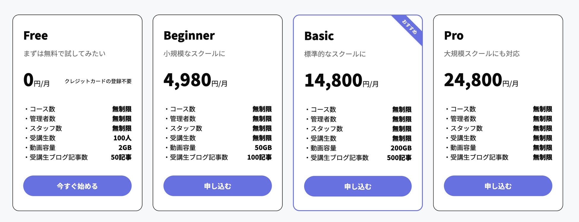 無料プランから、作成コース数は無制限、受講生も100人まで招待可能です。