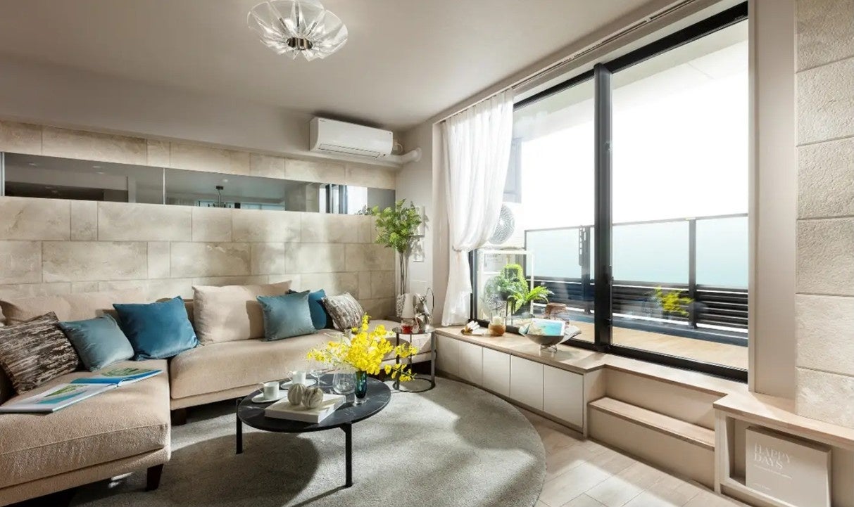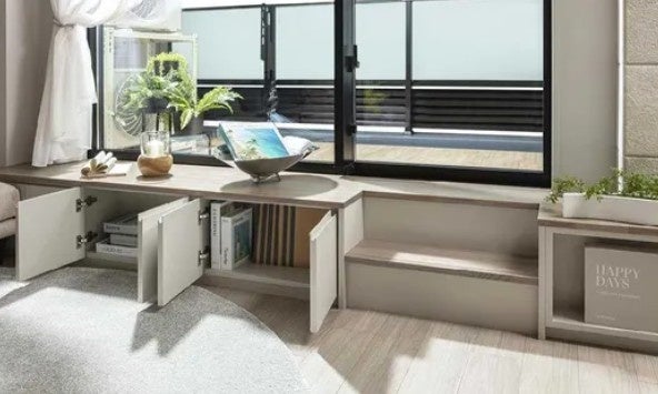 本物件は、伝統的な日本家屋の“縁側”に着想を得て、住まいの内と外をゆるやかにつなぐ境界空間を、現代の集合住宅に再構築したものです。その要となったのが、『半逆梁構造(はんぎゃくばり)』の採用です。通常は天井側に位置する梁を床側へ下げることで、バルコニーとの境に収納を備えたベンチスペースを設けました。さらに天井までの窓の広がりを生むことで、室内への豊かな採光を実現。これまで単なる通過動線だった窓際を、光や風、周囲の気配を感じながら過ごすコミュニケーションの場へと転換しました。