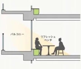 バルコニーと居室間に半逆梁構造の立上りを活用したベンチを設置。通過動線をコミュニケーションの場に。