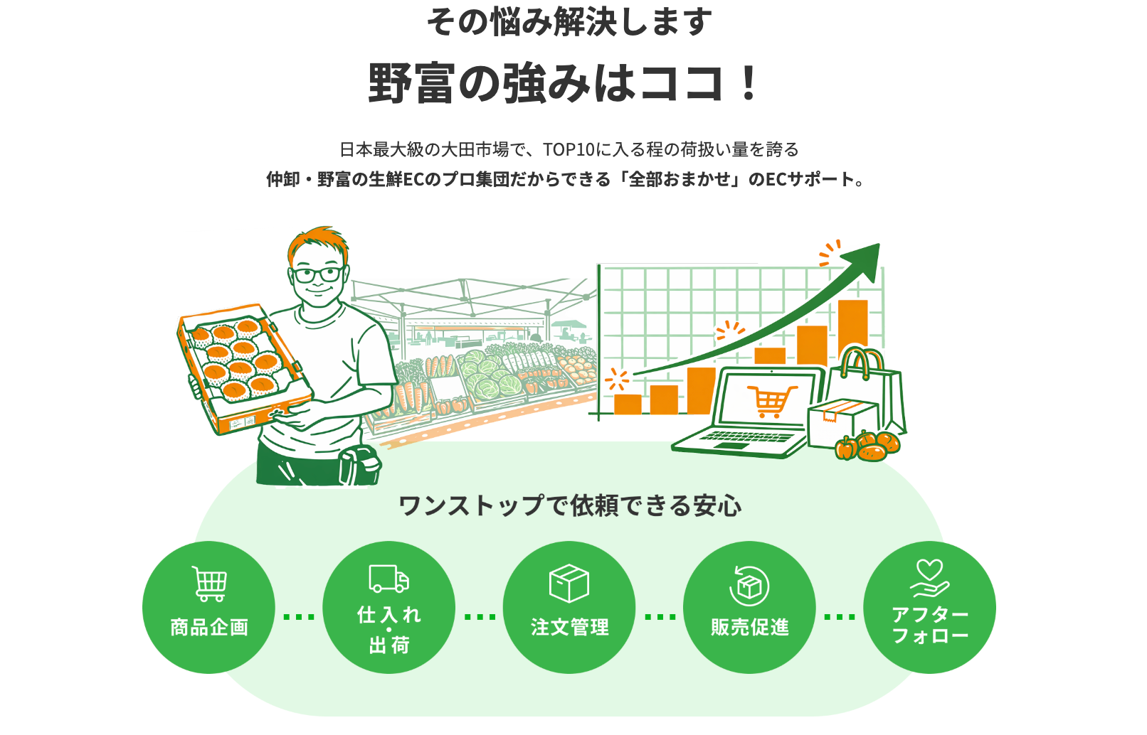 「商品ラインナップを増やしたい」「仕入れ先を安定させたい」「梱包・発送まで任せたい」──そんな課題をお持ちの方は、ぜひ野富のECワンストップサービスにご相談ください。年間600商品以上の取り扱い実績と、大田市場トップクラスの仕入れ力で、貴社のECの売上向上を全力で支援します。