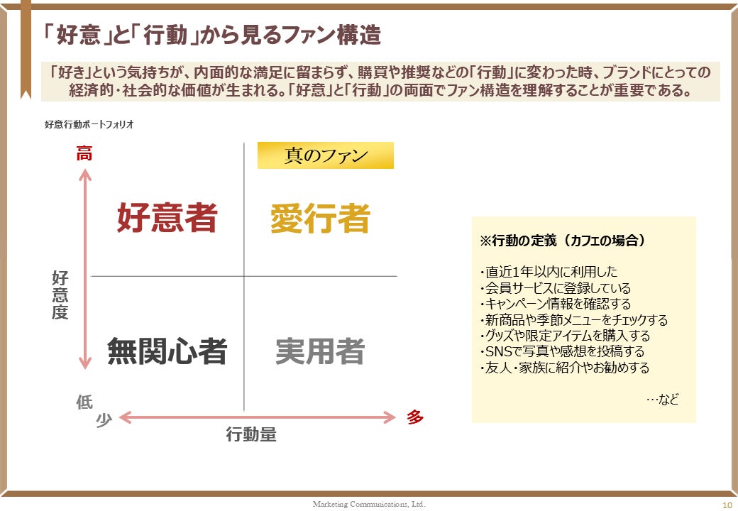そこで当社は、独自の分析フレームワーク「好意行動ポートフォリオ」を用い、カフェブランドのファン構造を「好意」と「行動」の両面から分析しました。