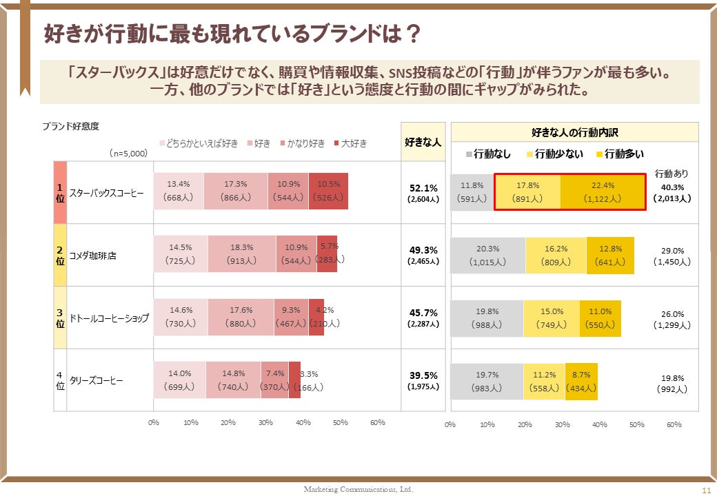 分析の結果、「好き」という感情だけでは購買などの行動には直結しない一方、スターバックスは好意だけでなく、購買などの具体的な行動が伴うファンが最も多いカフェブランドであることがわかりました。