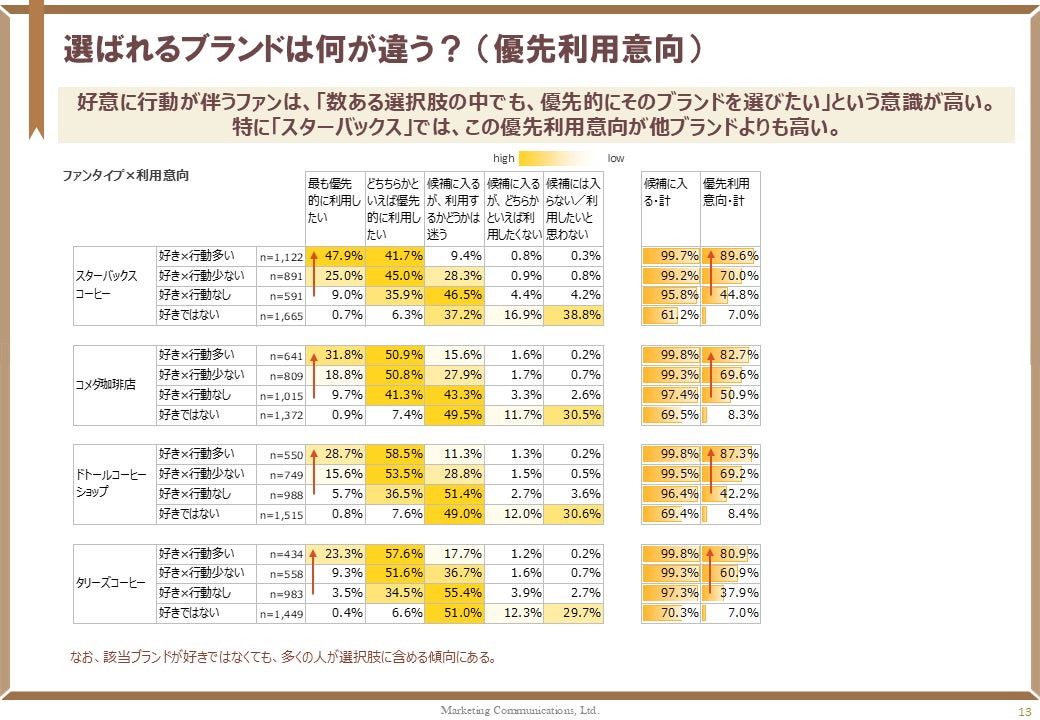 好意に行動が伴う層の特徴を分析したところ、「数ある選択肢の中でも、優先的にそのブランドを選びたい」という意識が際立って高いことがわかりました。