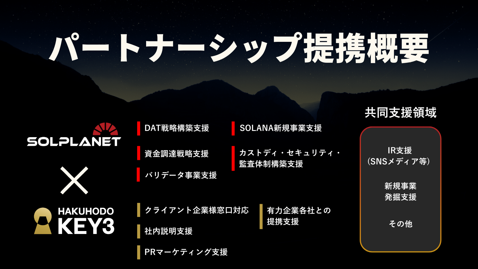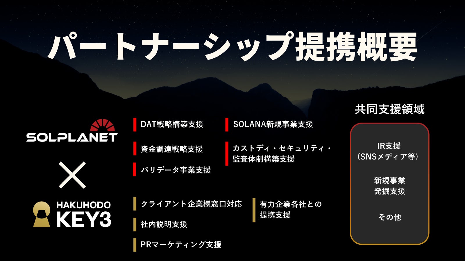 本提携により、Solanaの技術的優位性を活かした新しい資本市場の形成を推進してまいります。グローバルかつ24時間稼働するインターネットキャピタルマーケットの実現を通じて、日本企業の競争力強化と持続的な企業価値の向上に貢献してまいります。