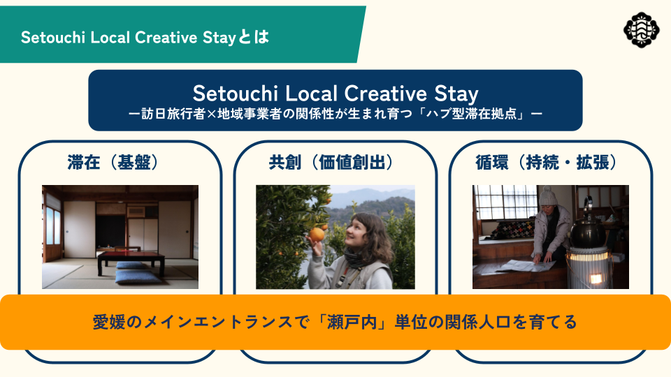 瀬戸内・大三島を起点に、長期滞在を通じて地域の日常に関わりながら、地域経済へ還元され、訪日旅行者の満足度も高まる仕組みを実装していきます。このモデルを愛媛にとどまらず、全国へ展開可能な事例へと育てていくことを目指します。