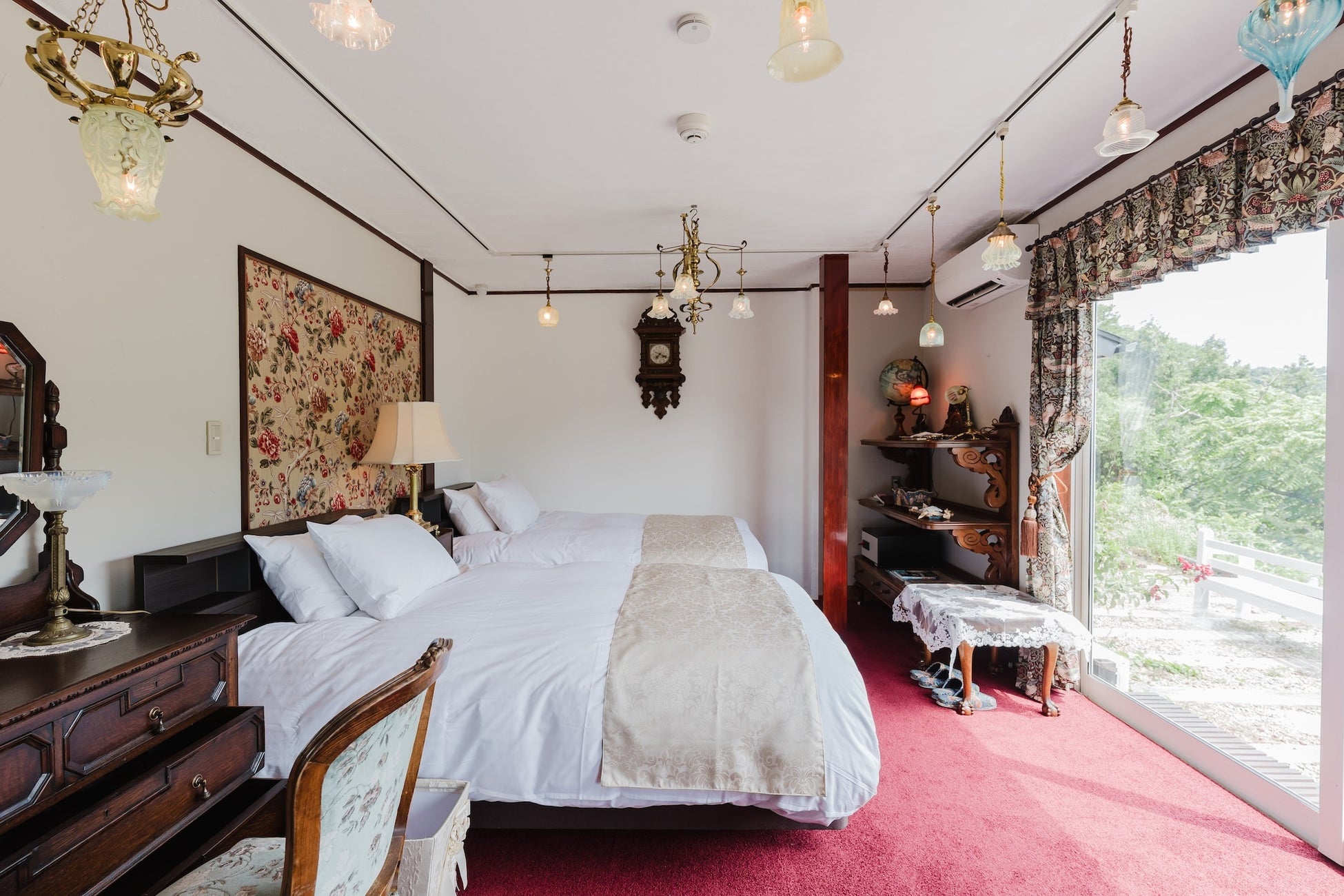 客室は、本場英国のアンティーク調度品に囲まれたリビングルームとベッドルームをご用意しております。テーマは「イギリスアンティークランプとウィリアム モリスのお部屋」です。個性豊かなランプや、ウィリアム モリスらしい自然や庭園の動植物をモチーフにしたインテリアファブリックにもご注目ください。どこか懐かしいイギリスの隠れ家のようなお部屋で、ゆったりお過ごしいただけます。