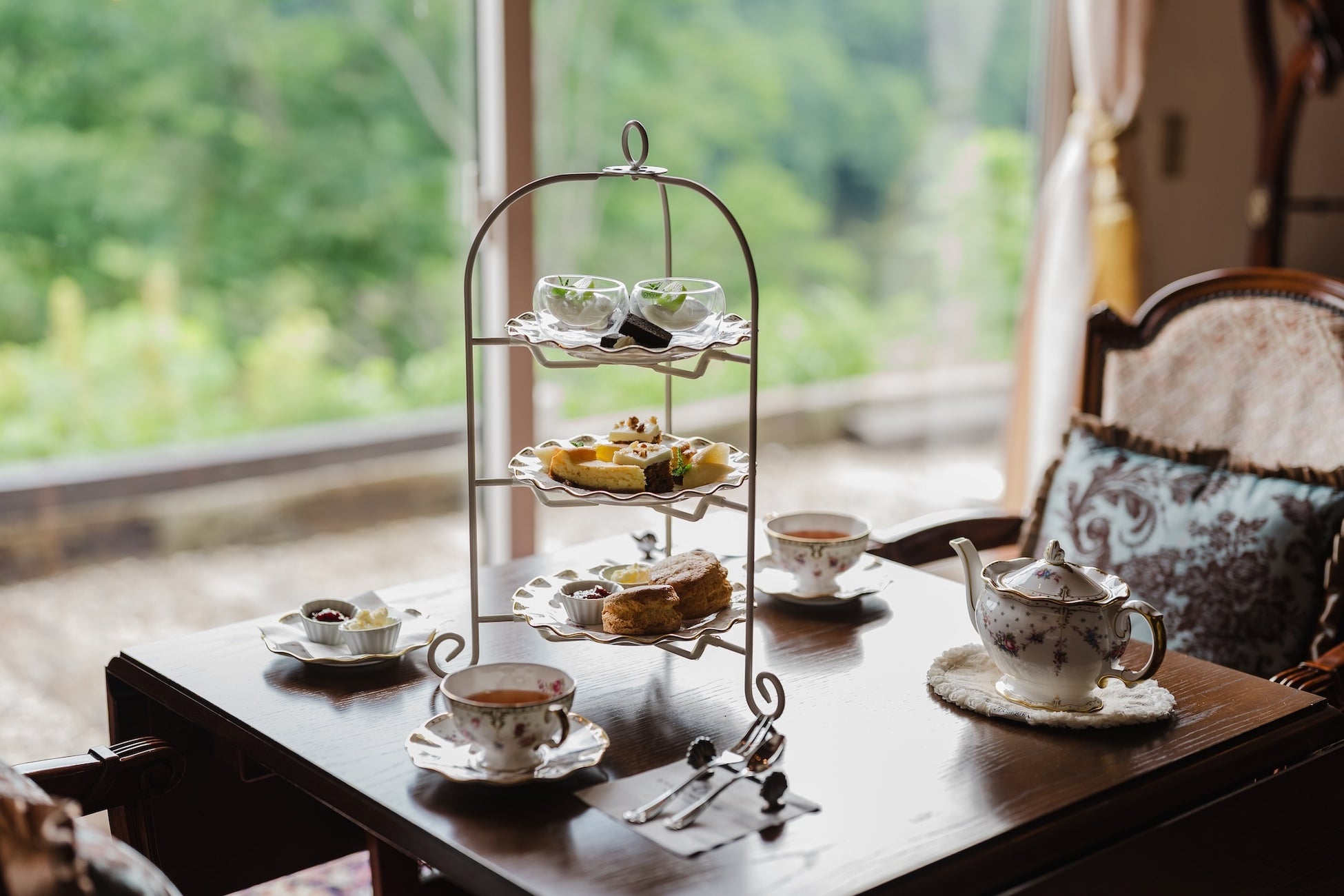 アフタヌーンティーはイギリス製の高級食器「ロイヤルクラウンダービー」で提供いたします。中でも、使用している「ロイヤル アントワネット」は最も愛されているコレクションの1つです。その優雅なたたずまいから、故・エリザベス女王がウィンザー城で朝食用として愛用されていました。併設のカフェでも大人気の英国式スコーンも、焼き立てをご提供。本格的なブリティッシュアフタヌーンティーをぜひオールインクルーシブでお召し上がりください。